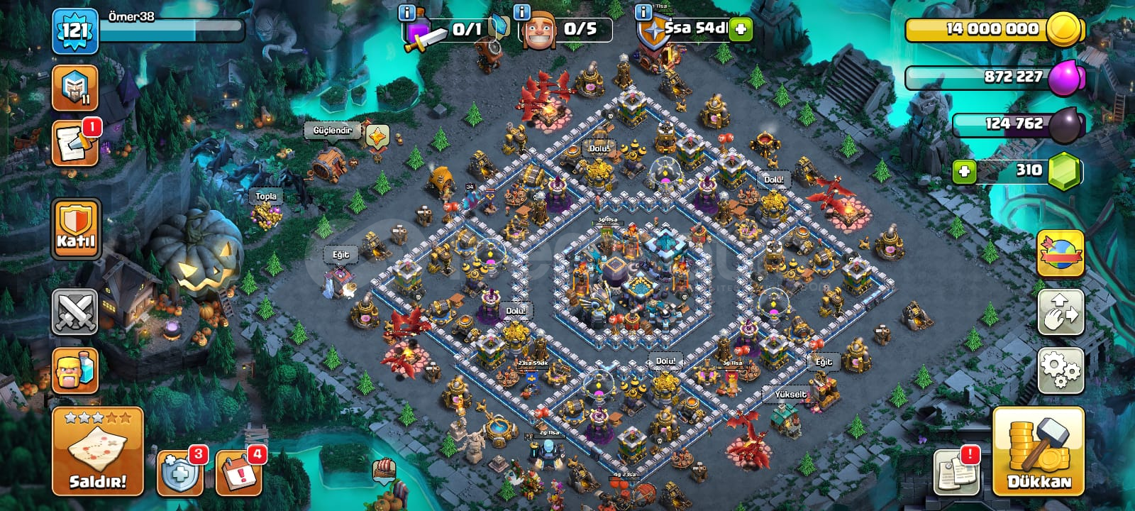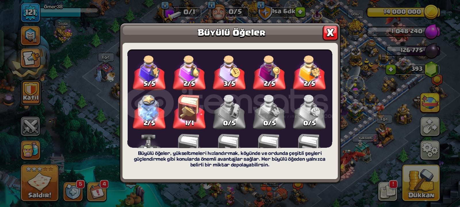 HESABIN ÖZELLİKLERİ :-121 LEVEL.-390 ZÜMRÜT'E SAHİP.-İÇERİSİNDE DEĞERLİ SKİNLER BARINDIRIR. (SÜPER TAKIM KRALI, GÖLGE KRALİÇE VB.)-ÇOK SAYIDA BÜYÜLÜ ÖĞESİ VARDIR.-KAYNAKLARI FAZLADIR-2 ADET KÖY BULUNMAKTADIR18:00-00:00 ARASI DİREKT TESLİMAT SAĞLANIR.