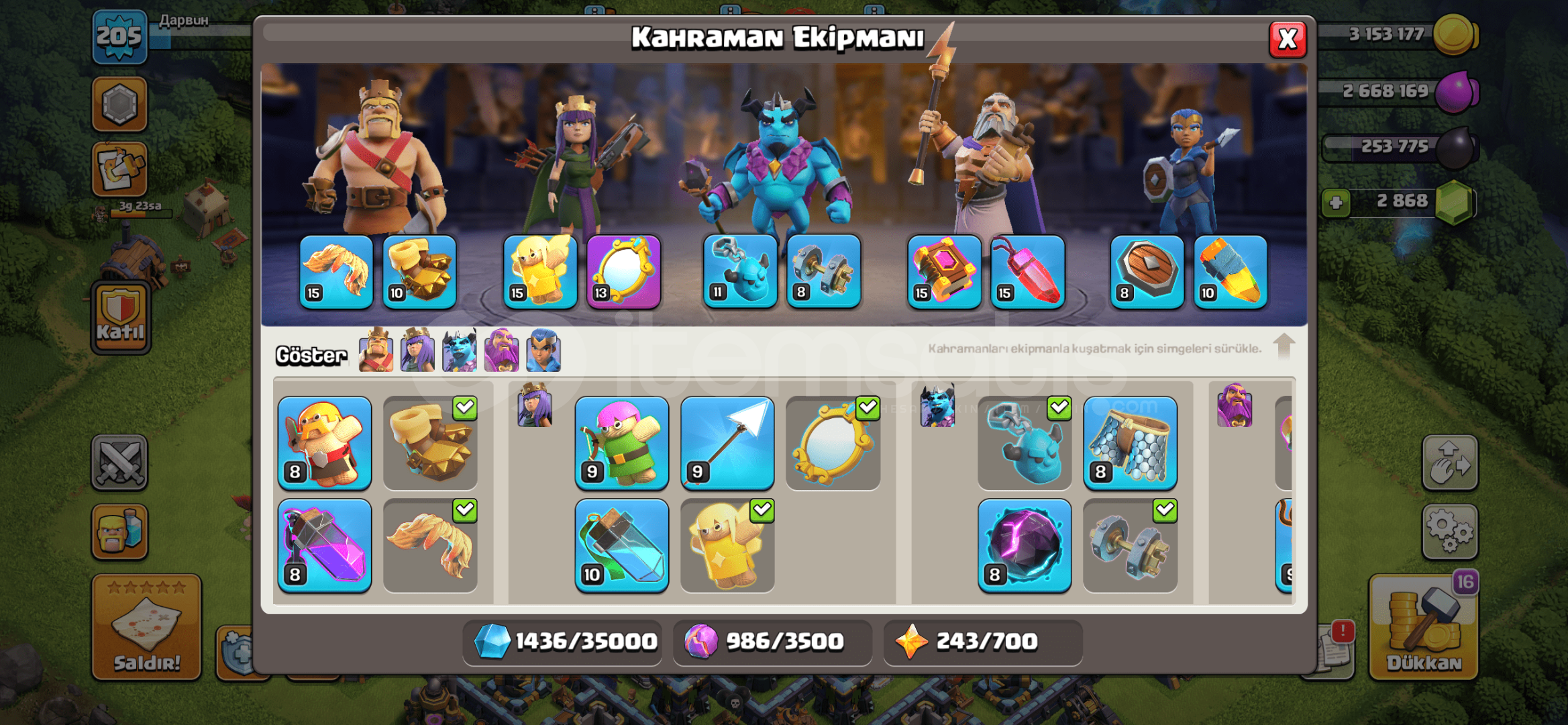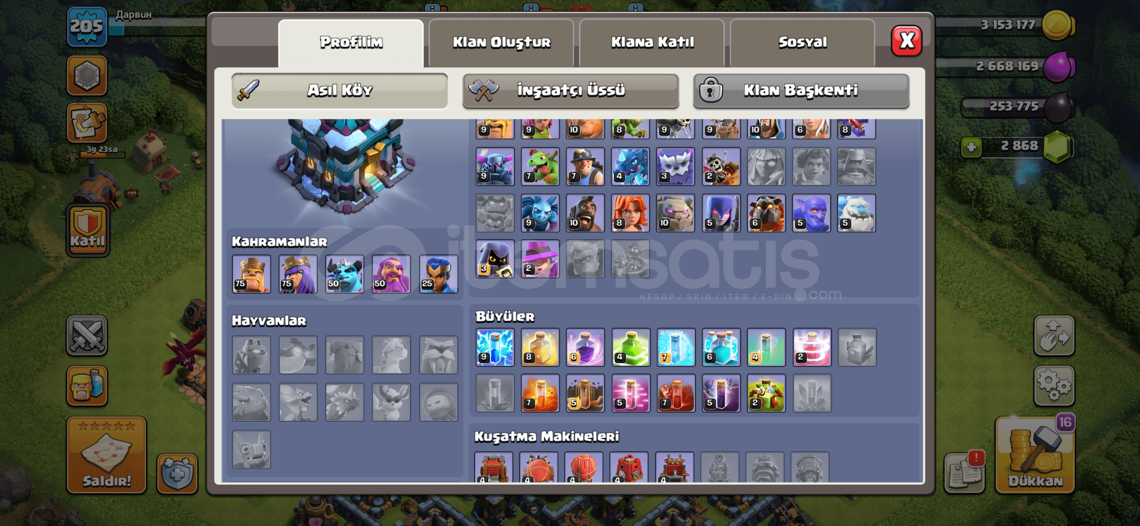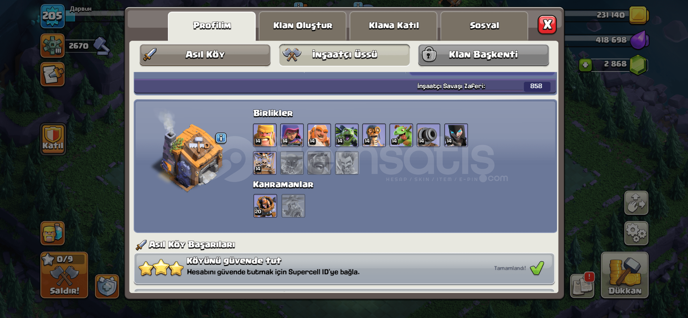 Resimlerde tüm detaylar mevcut. Full Belediye 13. İsim değiştirme hakkı ücretli 1500 taş. İsim Дарвuн (eski isim gir isterse buradan kopyala)Ayrıca 2900 taş var. Supercell ID Gmail hesabına bağ- stokta ödeme sonrası Size Gmail bilgileri sunulacaktır. Oyuna girip Gmail hesabı değişikliği yapın! Alana şimdiden hayırlı olsunԅ...