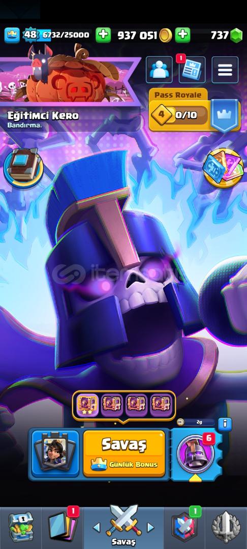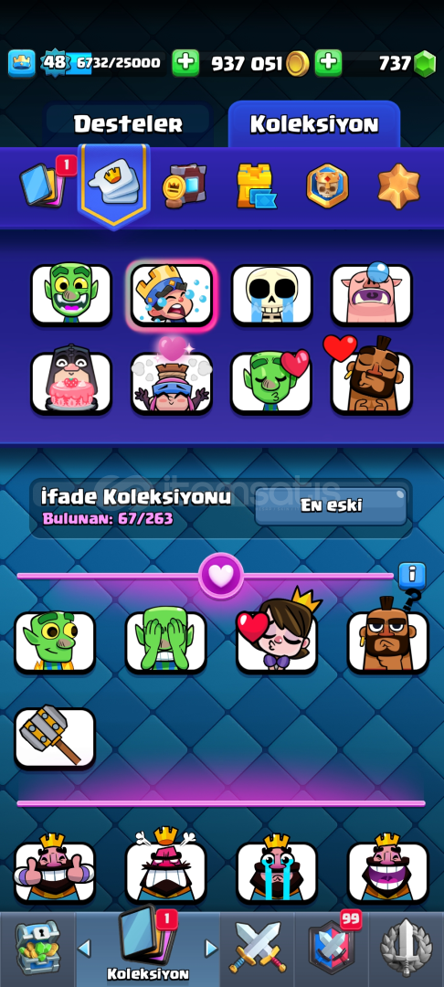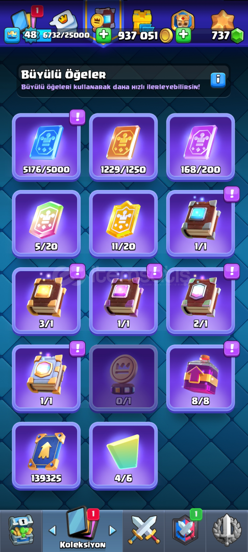 Oyunu bıraktığım ve derslerime odaklandığım için kendi hesabımı satıyorum.Prenses kulesi 14 level, Çoğu kart 12,13 leveldir. Fakat fotoğraflarda da gördüğünüz gibi büyülü eşyalarla hızlıca istediğiniz kartlara level atlatabilirsiniz.Birçok önemli emoji mevcuttur.900.000+ Altın 730+ Yeşil Taş4 evrim parçasıBol flamalı48 L...