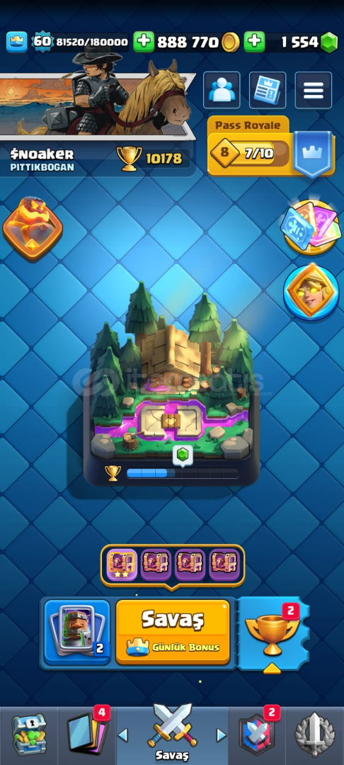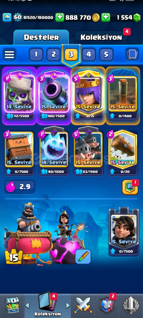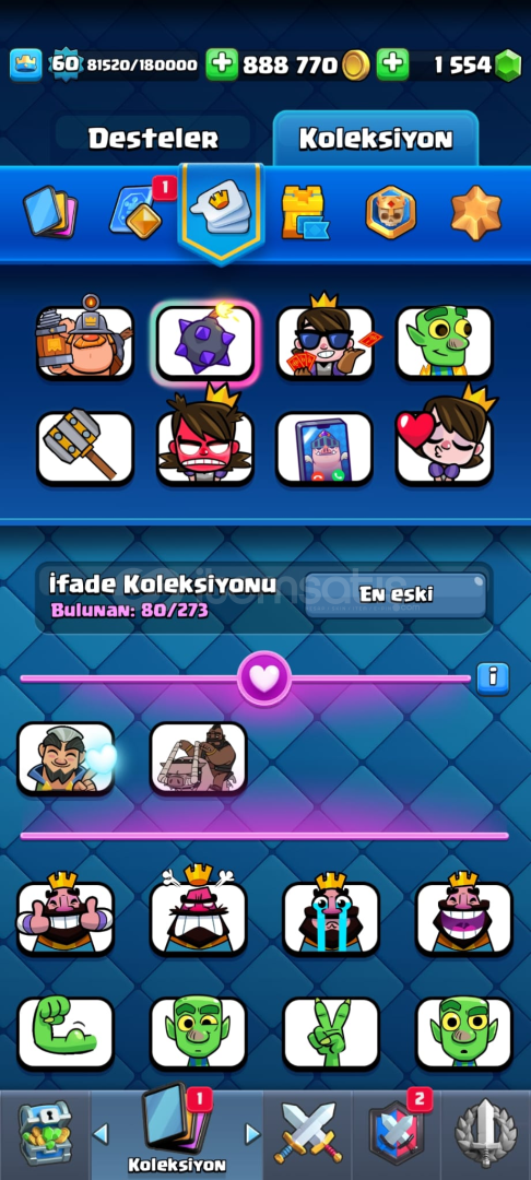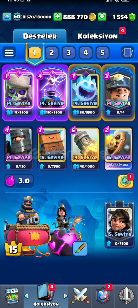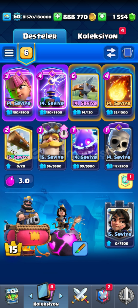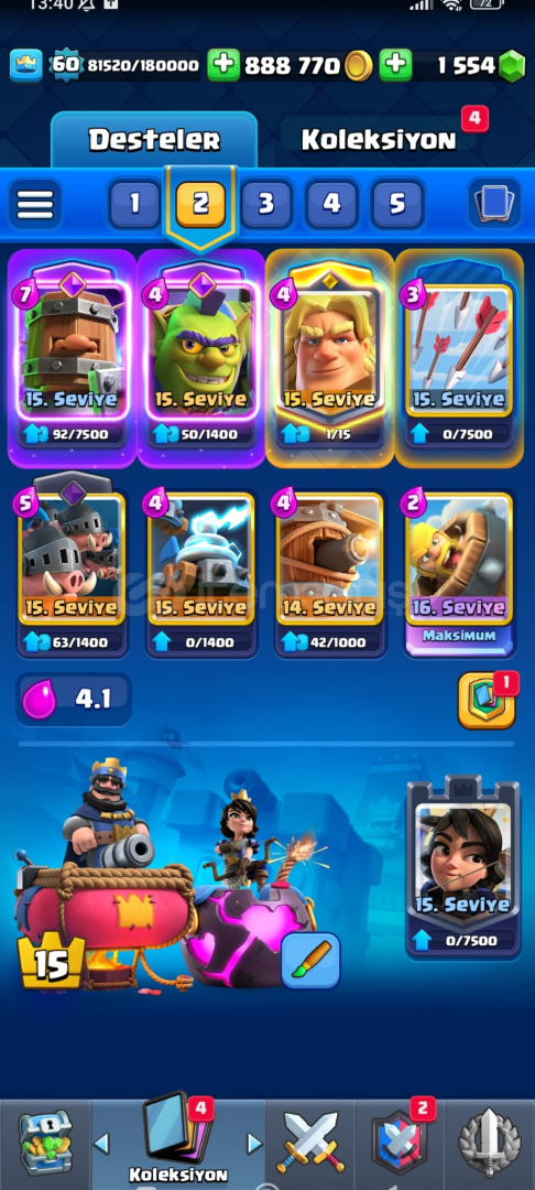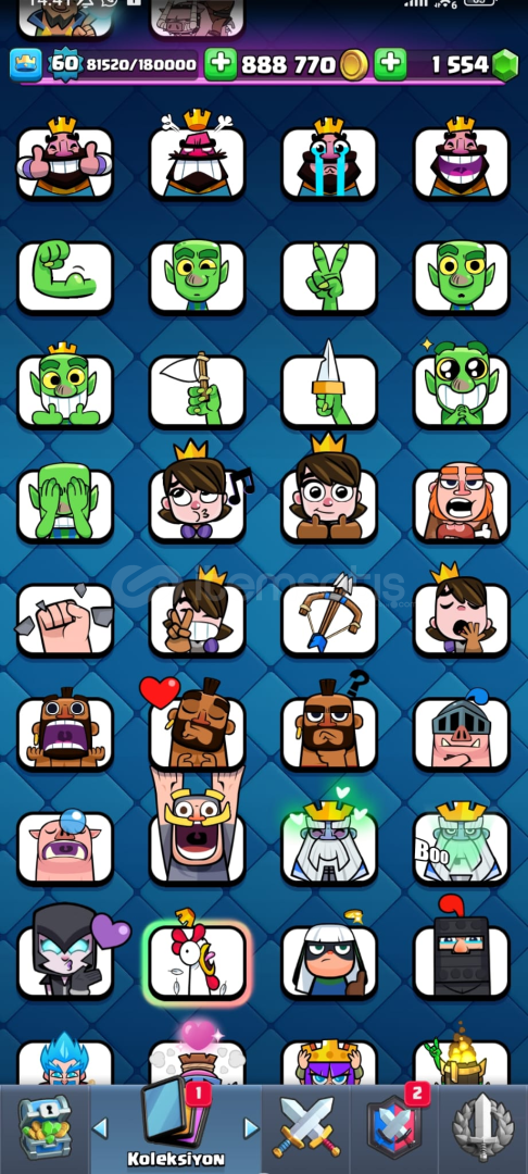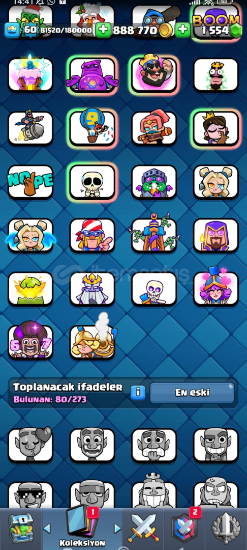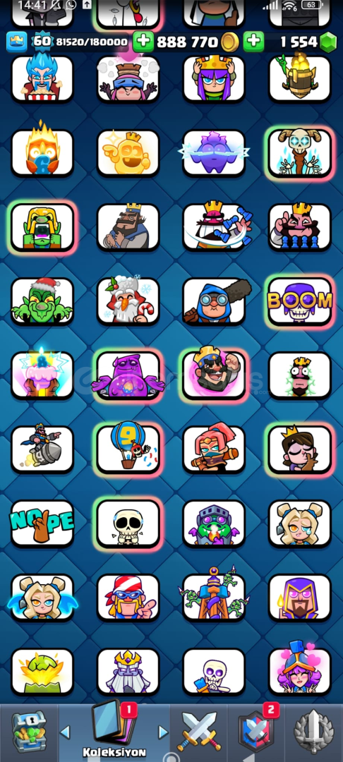 Hesap Seviyesi: 60 SEVİYEEn yüksek kupa: 15.000 KupaEvrim Sayısı: 13 Evrim + 5 EVRİM PARÇASI + 5 YARIM PARÇALI EVRİM + 5 PARÇA CADI EVRİMEmoji Sayısı: 80 İsim Değiştirme Ücreti: 500 TaşHesaptaki Taş Miktarı: 1500 TaşHesaptaki Altın Miktarı: 800.000 AltınHesaptaki Kule Desen Sayısı: 5Hesaptaki Flama Sayısı: 75Ayrıca,2 TANE 16 SEVIYE 11 TANE 15 SEVI...