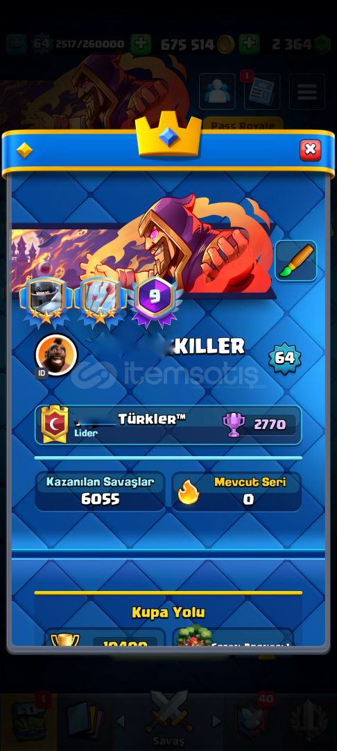 Hesap 9 yıllık 9️⃣10.000 kupa 🏆/ 64 levelHesabımız 2770 kupalı klan lideridir. (hesabı alan direkt liderliği de alacaktır.)250 adet devasa emoji koleksiyonu 💬 (7.500 ID rewards puanı ile alınmış 3 adet kıymetli emoji) (zamanında 1000-2000 tl arası ücretle alınmış kimsede olmayan emojiler 🔥)Hesap Nihai şampiyon oldu emojisi mevcut26 adet evrim açık &...