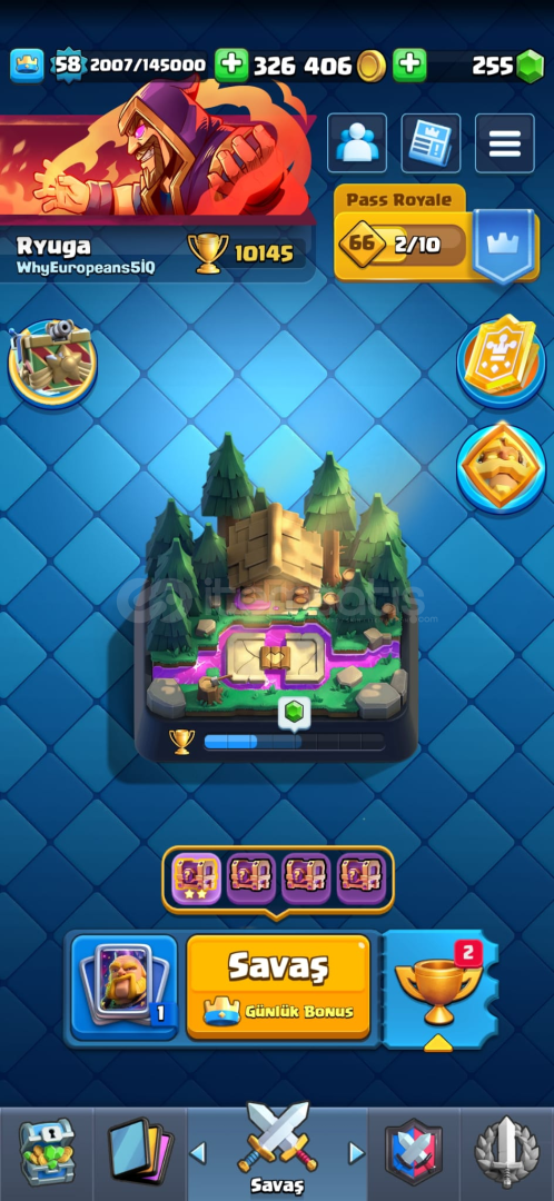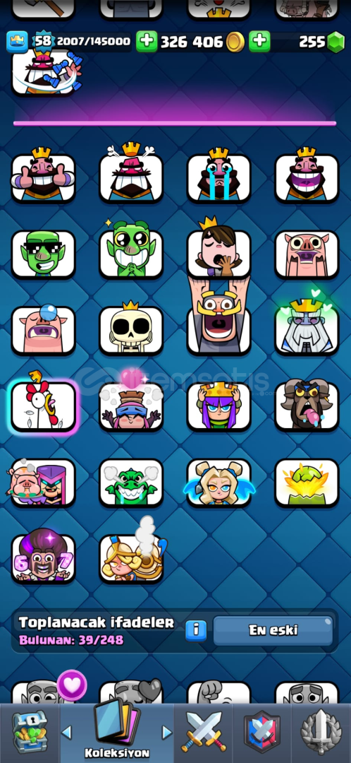 Hesap 10145 kupadır.326.000 Altın.255 Yeşil Taş.58 Seviye.Seook Emojisi,Hypnos Tokmak Emotu ve diğer para ilen satılan emotelar mevcuttur.(Mimimi dahil.)Pazarlık yapılır,hesap supercell id mail değişimi üzerinden verilecektir.Kraliyet Devi destesi main destedir,kart seviyeleri için 3 bin tl yatırılmıştır.Seviyeler çok iyidir.Evrimler : Kraliyet Devi,Avcı,Okçular,Tesla,Büyüc&uu...