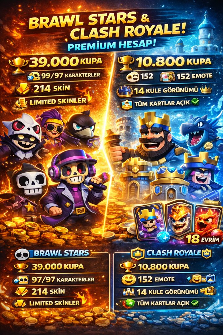 HESAP ÖZELLİKLERİ(Clash Royale)-Hesap 3 yıllık hesaptır.-Hesap 10.882 kupadır.-Hesapta 152 emote mevcuttur.-Hesapta tüm kartlar açıktır.-Hesap 60. Seviyededir.-Hesapta 14 kule görünümü mevcuttur.-Hesapta 18 kart evrimlidir.-Hesap Türkiye'de oluşturulmuştur. HESAP ÖZELLİKLERİ(Brawl Stars)-Hesap 2020 yılında oluşturulmuştur.-Hesapta Beyaz Kurt Leon, Başsız Stu, ...