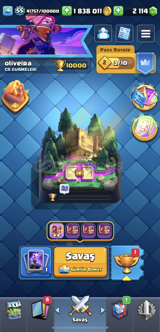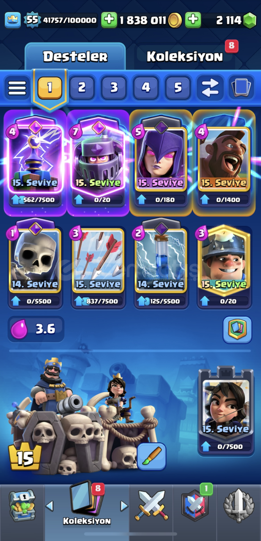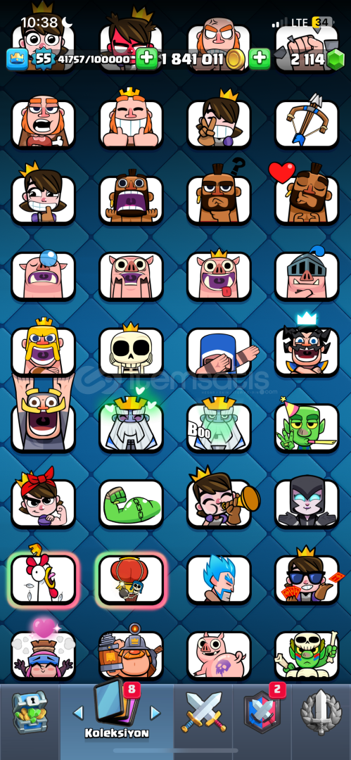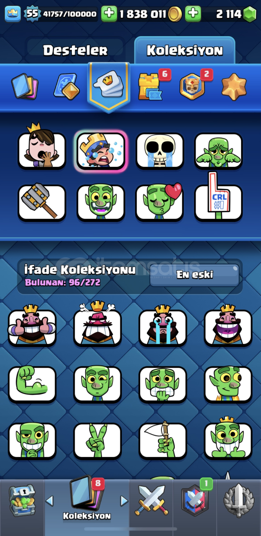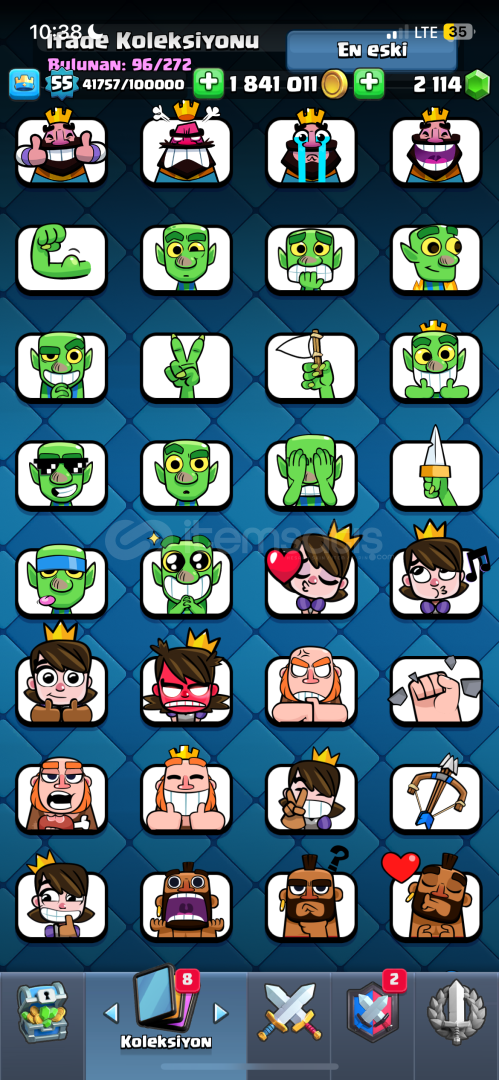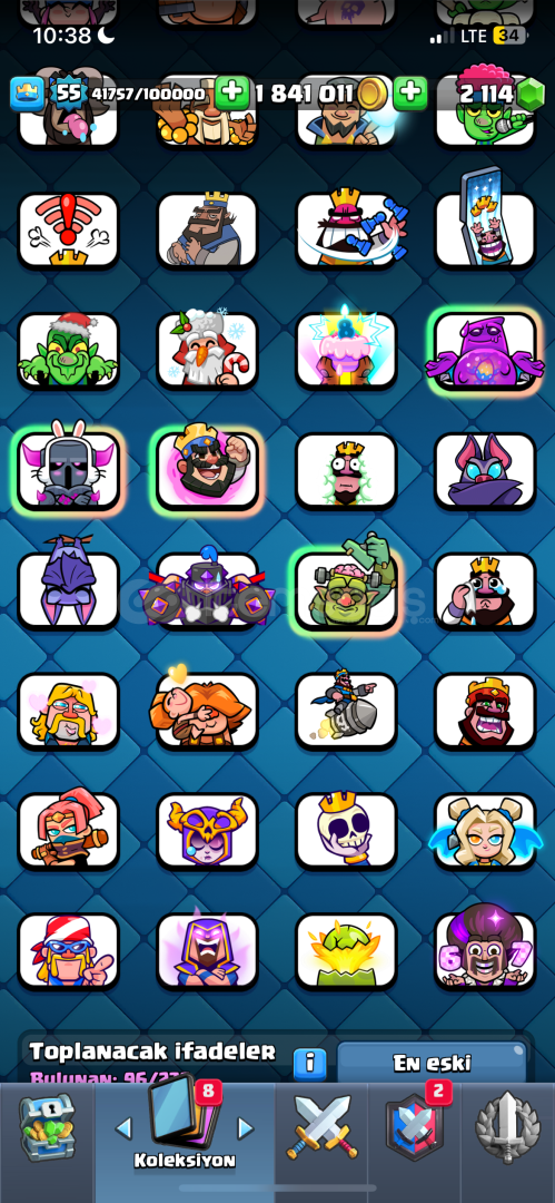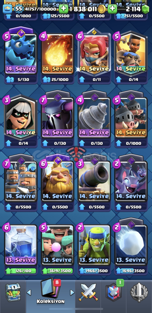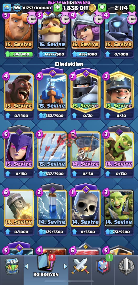 10 bin kupa55 seviye96 emoji- paralı emojiler mevcut1.800.000 altın/ 2200 yeşil taş mevcut15 evrim açıkisim değişiklik hakkı varkartların çoğu max (14-15 seviye)supercell id bağlı