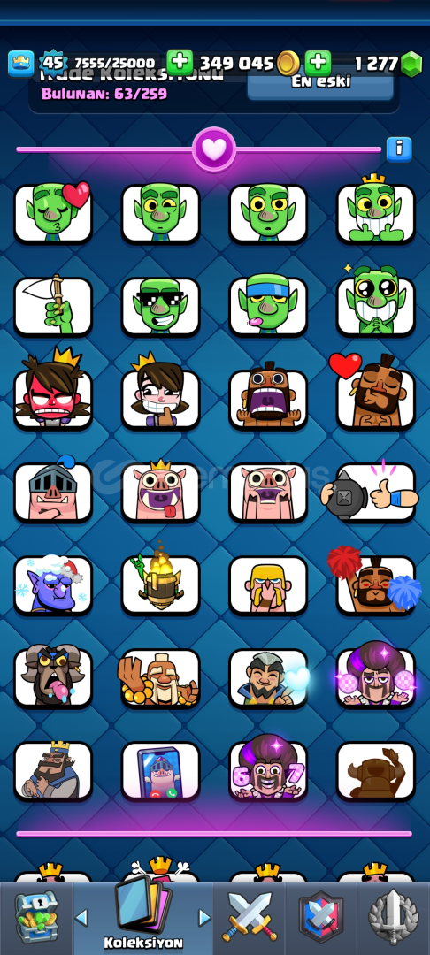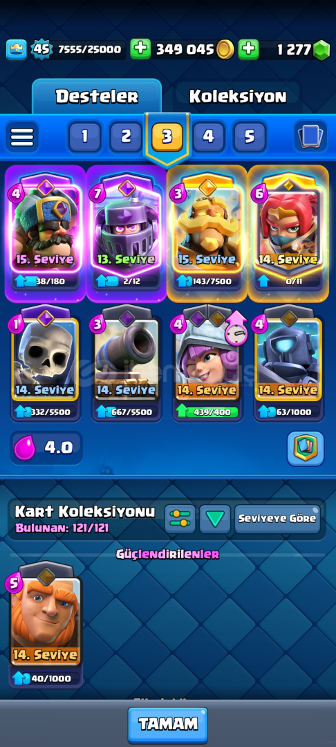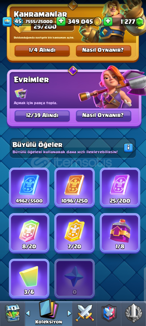 10 bin kupa 350k altın 1277 taş 63 ifade 3 joker parça büyülü öğeler dolu kahraman şövalye evrimler: mega şövalye, iskeletler, bombacı, fırın, buz ruhu, cadı, avcı, büyücü, electro ejderha, okçular, barbarlar, tesla, 3 iskelet fıçısı, 3 cellat, cehennem ejderhası, 3 dart goblini, 2 kraliyet hayaleti, 2 silahşördolunun dolusu hesap alana hayırl...