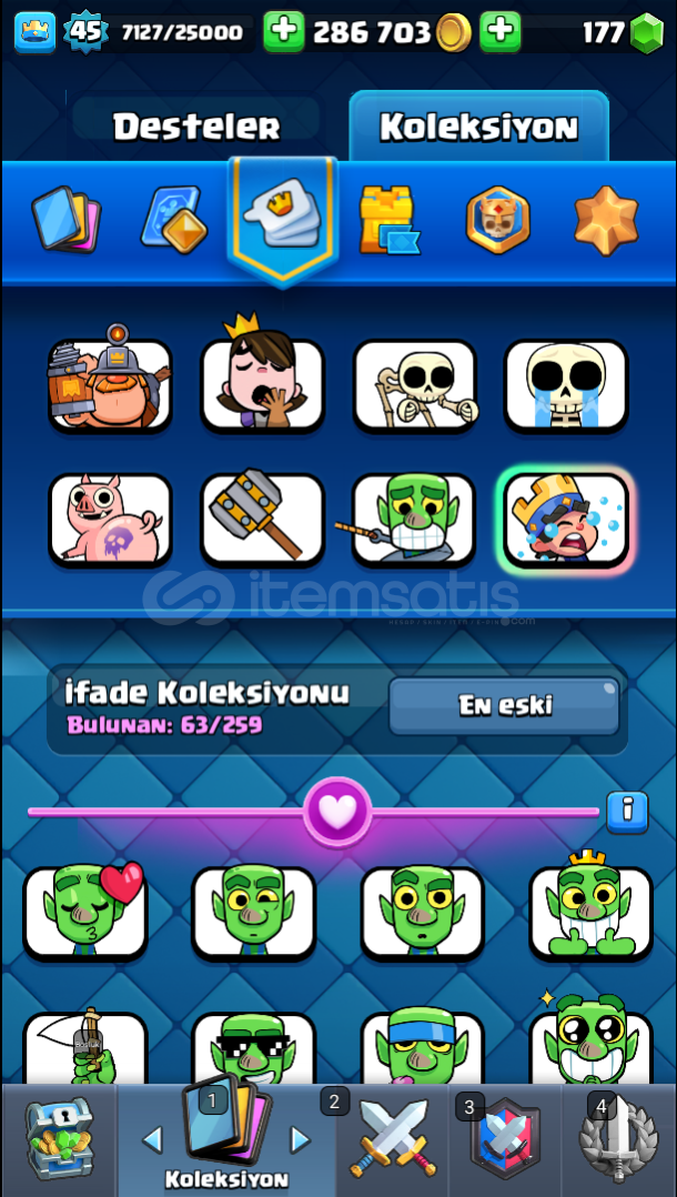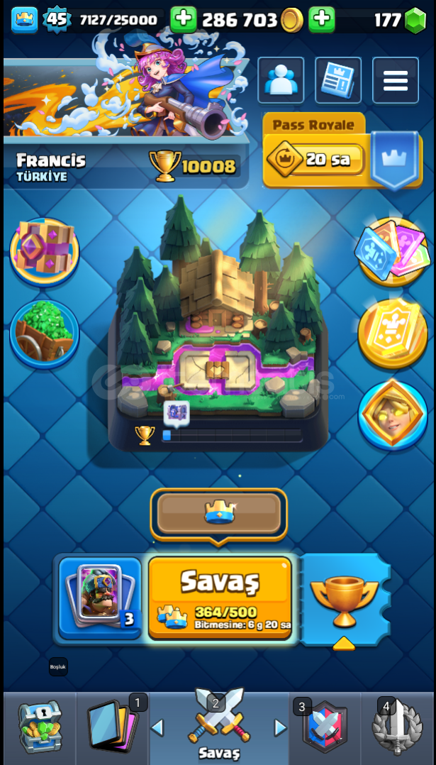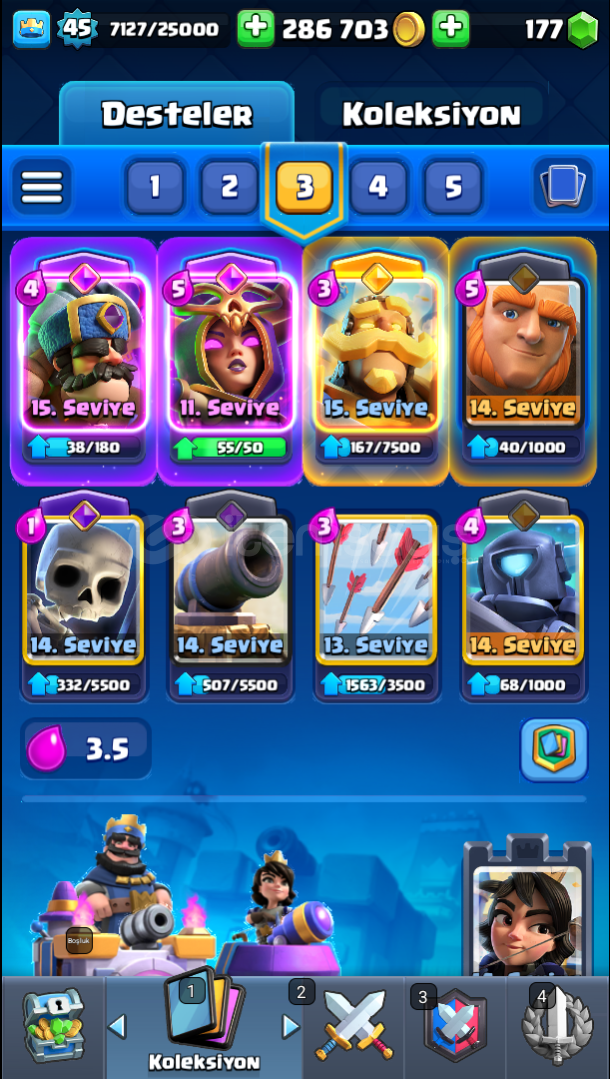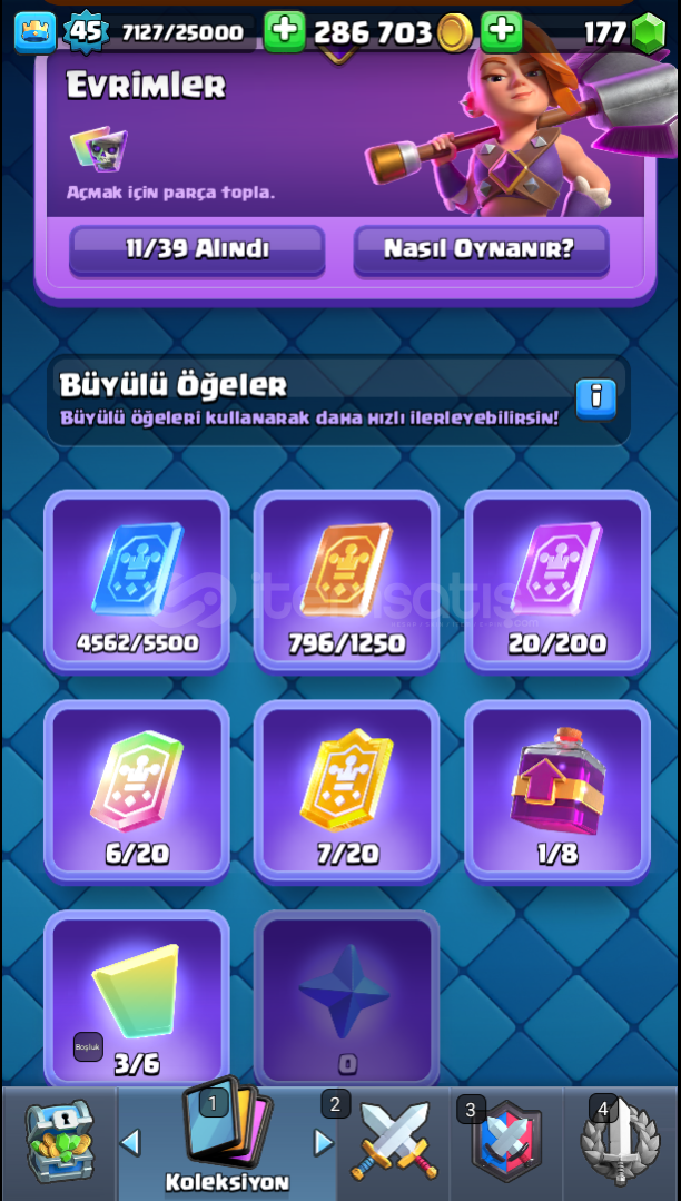 63 ifade6 kule görünümü3 joker parçatüm kartlar açık full hesapevrimler: mega şövalye, iskeletler, bombacı, buz ruhu, fırın, avcı, cadı, electro ejder, büyücü, okçu,tesla, barbarlar, 2 silahşör, 3 isketelet fıçısı, 3 cellat, 3 cehennem ejderhası, 3 dart goblini, 2 kraliyet hayaleti parçasıhesap koruması kapalıdıroyunu bırakt...