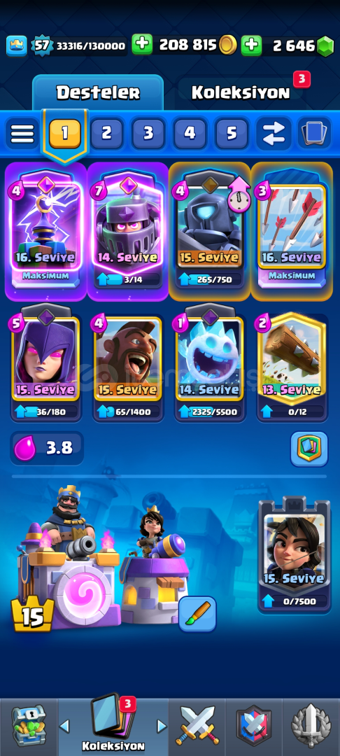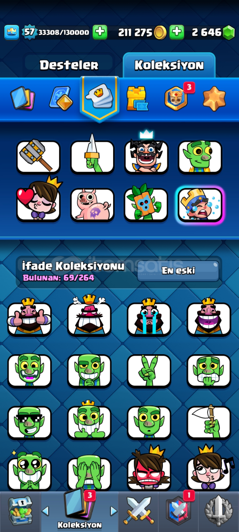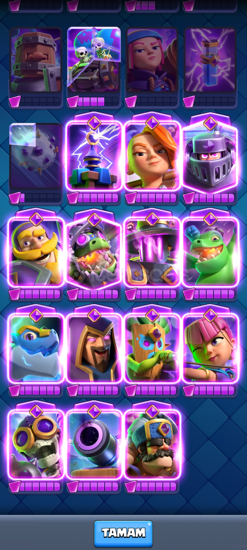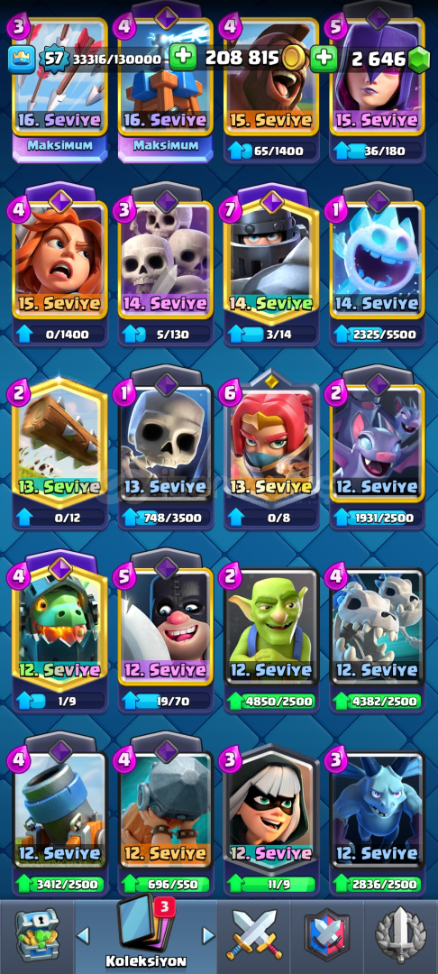 Hesapta 14 Evrim, 4-5 adet de yarım evrim vardır. Yarım evrimleri açabilecek kadar parça var. 2 adet 16 seviye kart var. Tüm kartlar açık ve 2600+ taş var. 69 adet emoji var hepsi birbirinden güzel emojidir. Anlık 10096 kupadır. Çoğu kartın seviyesi yüksektir. Alıcısına şimdiden hayırlı olsun...