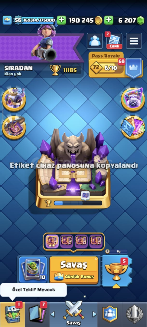 Eposta:şifre formatında ve hesabı nasıl üzerinize alacağınızın hakkında bütün bilgiler satın alınca otomatik iletilecek!Hesaba detaylıca bakmak için:https://royaleapi.com/player/2GLU9920GHesaplar asla geri çekilmez!Hesap koruması aktif değildir!Yeni güncelleme sebebiyle sezon geçişlerinde CLASH ROYALE HESAPLARINDA kupa kaybı yaşanabiliyor bilginize.Fiyatlandırmalar g...