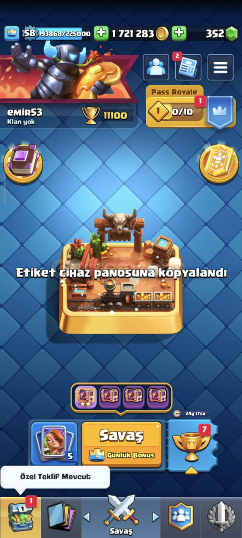 Hesaba detaylıca bakmak için: #2CLGLC9GCHesaplar asla geri çekilmez!Hesap koruması aktif değildir!Yeni güncelleme sebebiyle sezon geçişlerinde CLASH ROYALE HESAPLARINDA kupa kaybı yaşanabiliyor bilginize.Sipariş Sonrasında oluşacak sonular için kalıcı destek!"Neden beni tercih etmelisiniz?"+660 Başarılı işlem.Yüksek müşteri memnuniyeti.Supercell oyunu içinde 500+ Faz...