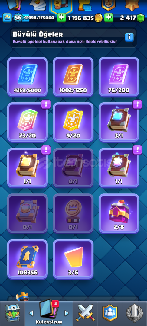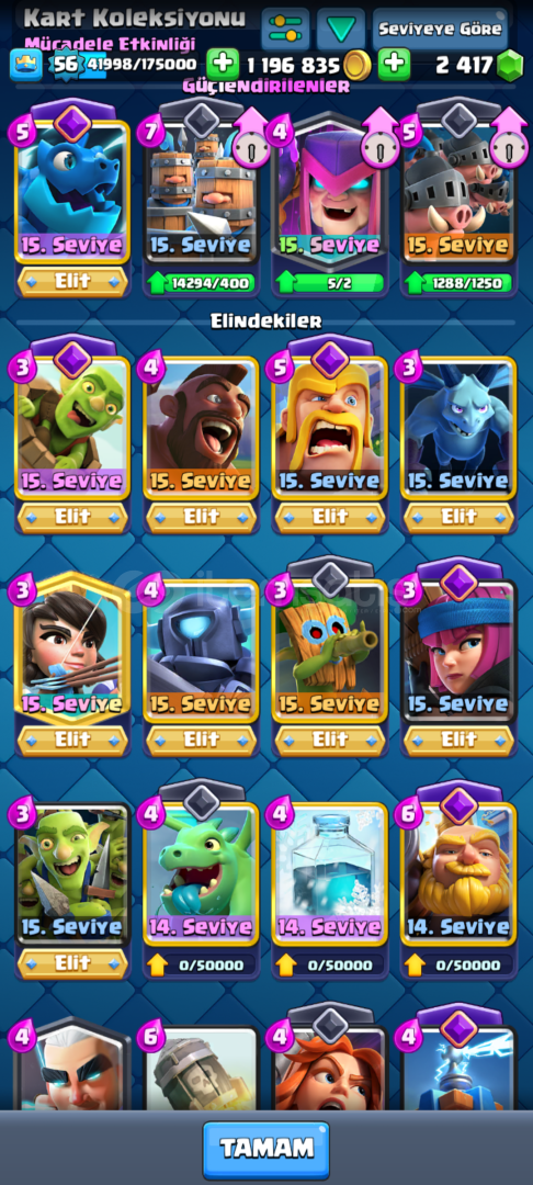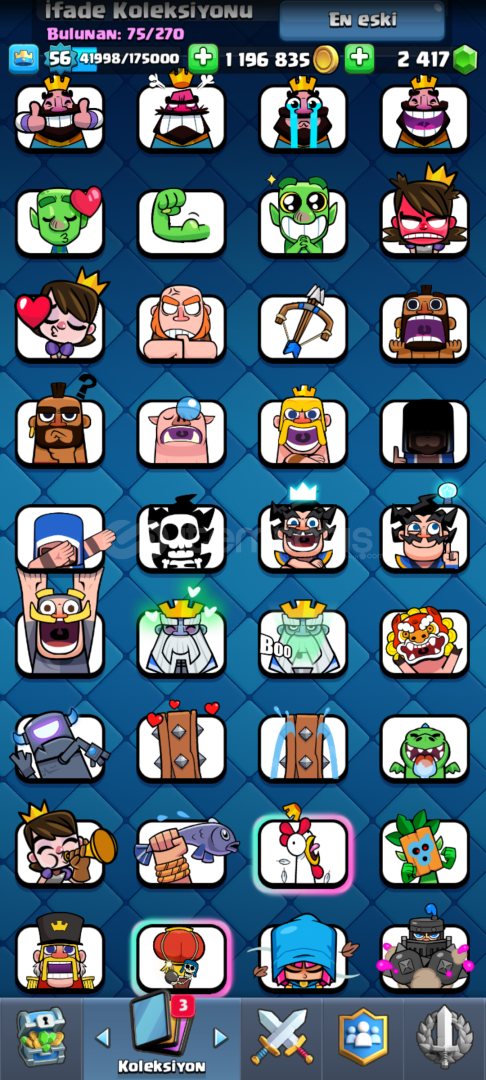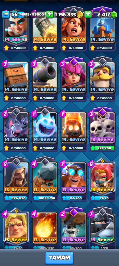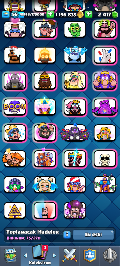 11k kupa 12 elit karakter (14 tane yapılabilir) 14 14seviye karakter (daha fazla yapılabilir hesaplanmadı) 2 elit kule birliği (4 kule birliği var) 75 emoji Yeteri kadar dolu büyülü öğeler 10 ad. evrimli kart (11 ad. yapılabilir) mail ile teslim Ürün resimde göründüğünün aynısıdırTüm kartlar vardırFiyat öldürülmediği sürece pazarlık vardır