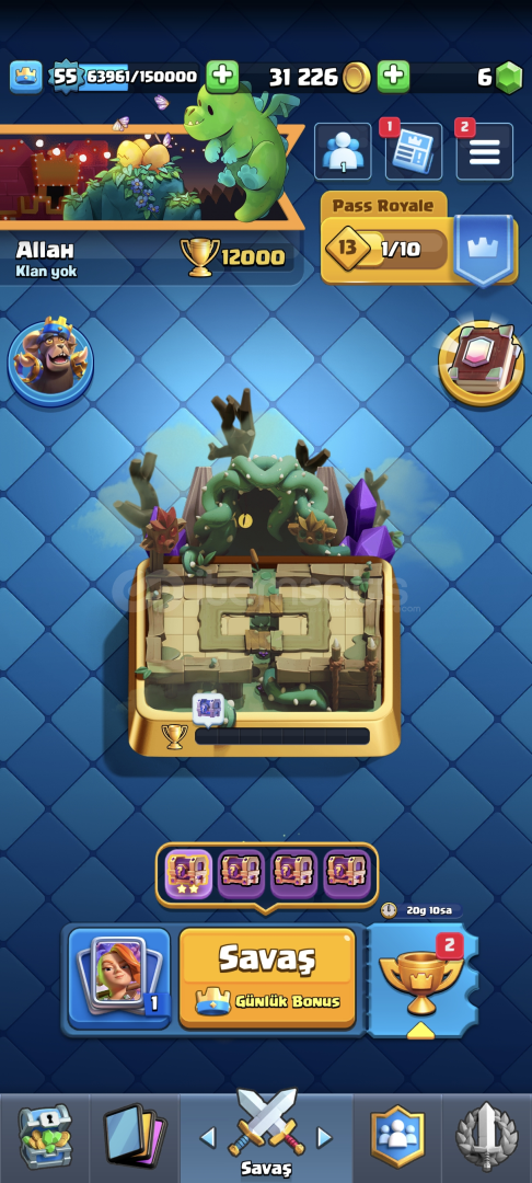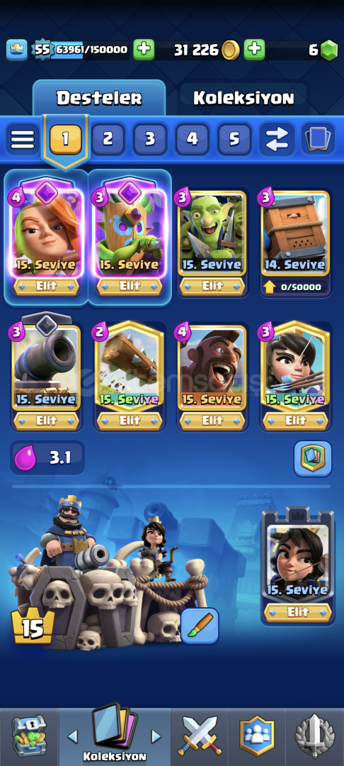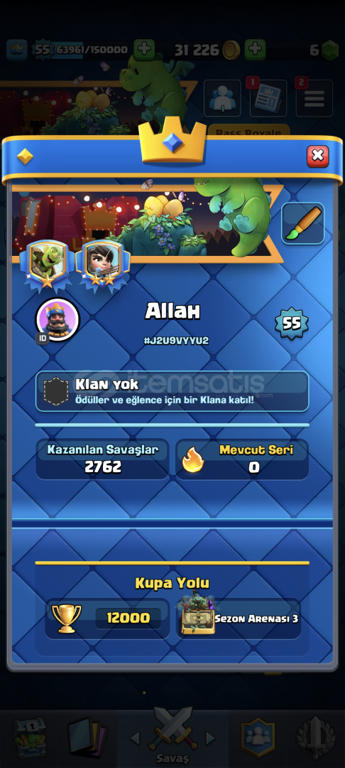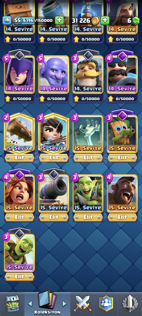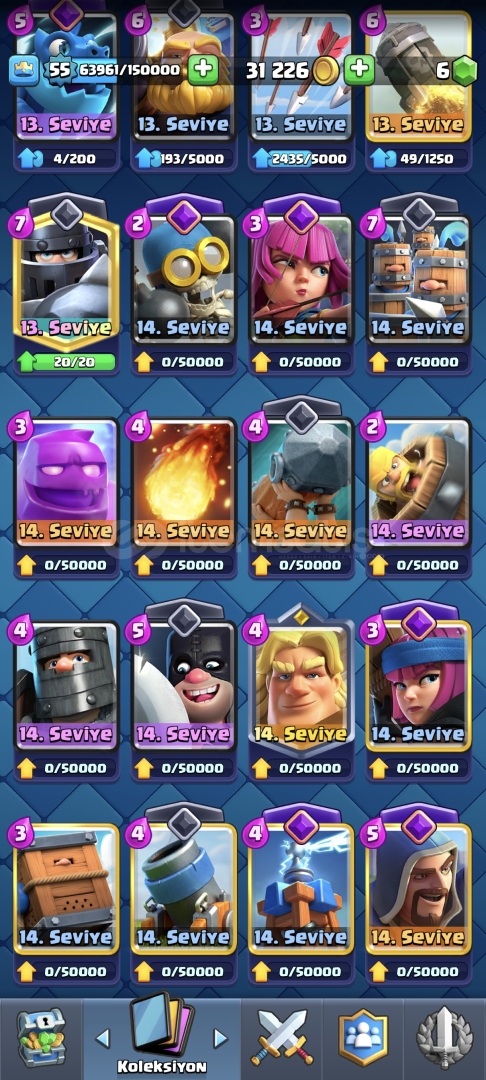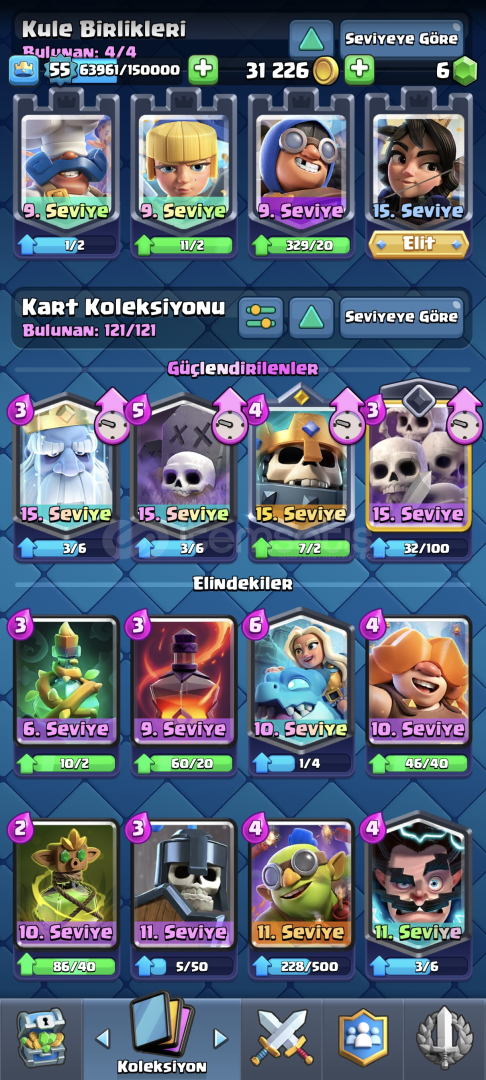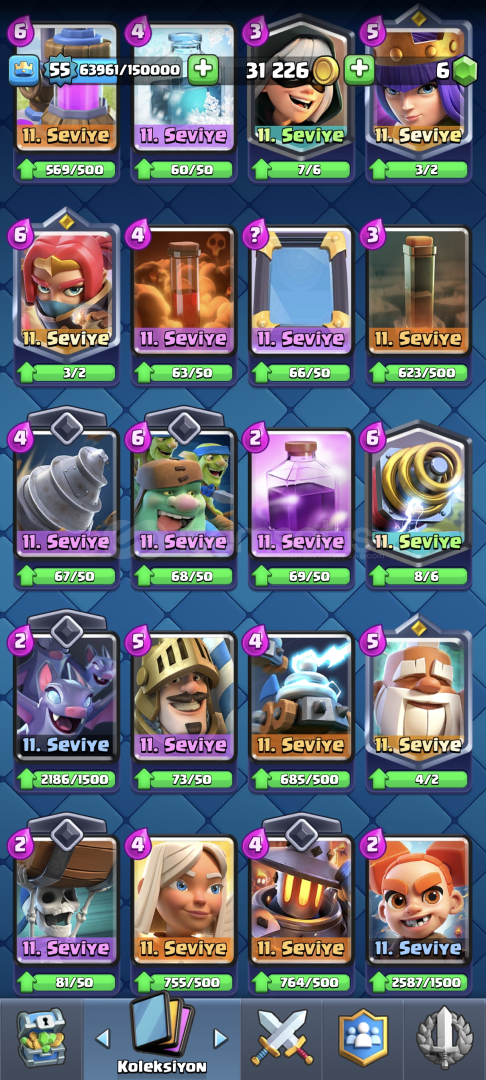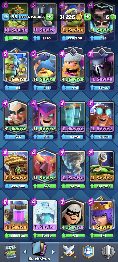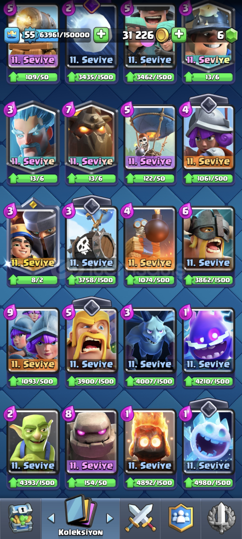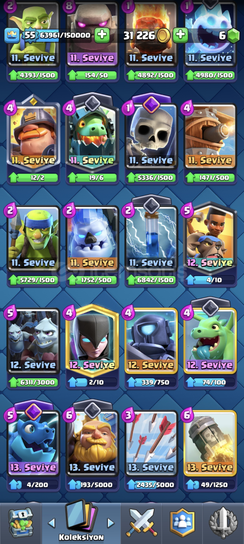 Hesap 12k kupa 55 seviyedir. Bütün kartlar açık ve geneli yüksek seviyedir. 11 tane evrim mevcut ve bir kaç kartın evrimi yarı seviye.İsim değiştirme hakkı var. 91 emoji var popüler çoğu emoji vardır. Sınav senem olması nedeniyle satıyorum alacak arkadaşa şimdiden hayırlı olsun.