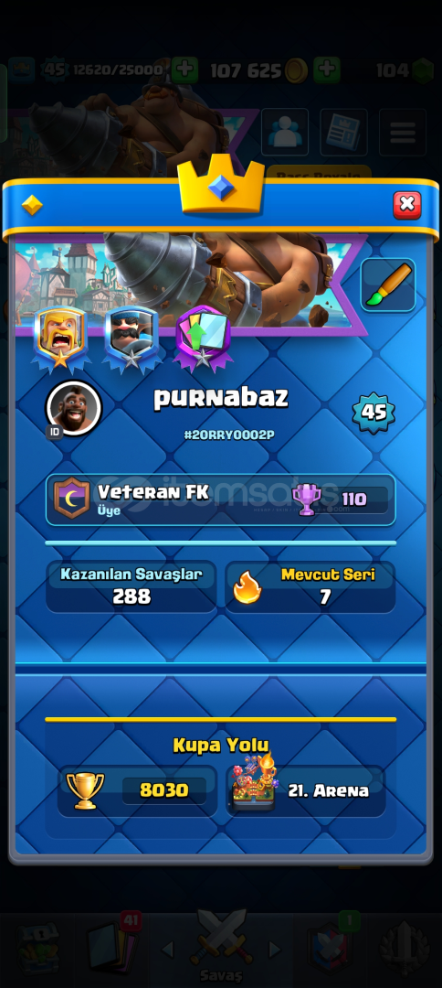 HESAP GÜVENLİĞİHesap koruması aktif değildirMail değişimi yeni yapılmıştırTekrardan mail değişimi yapmak için minimum 15 gün süre vardırHesaplarımız yalnızca tek bir kişiye satılır ve yalnızca size ait olurHESAPLARIMIZ ASLA AMA ASLA ÇALINTI DEĞİLDİR TAMAMEN ŞAHSİ OYUN HESAPLARIDIRHESAP ÖZELLİKLERİ8030 kupa , 21. arenadaMax l...