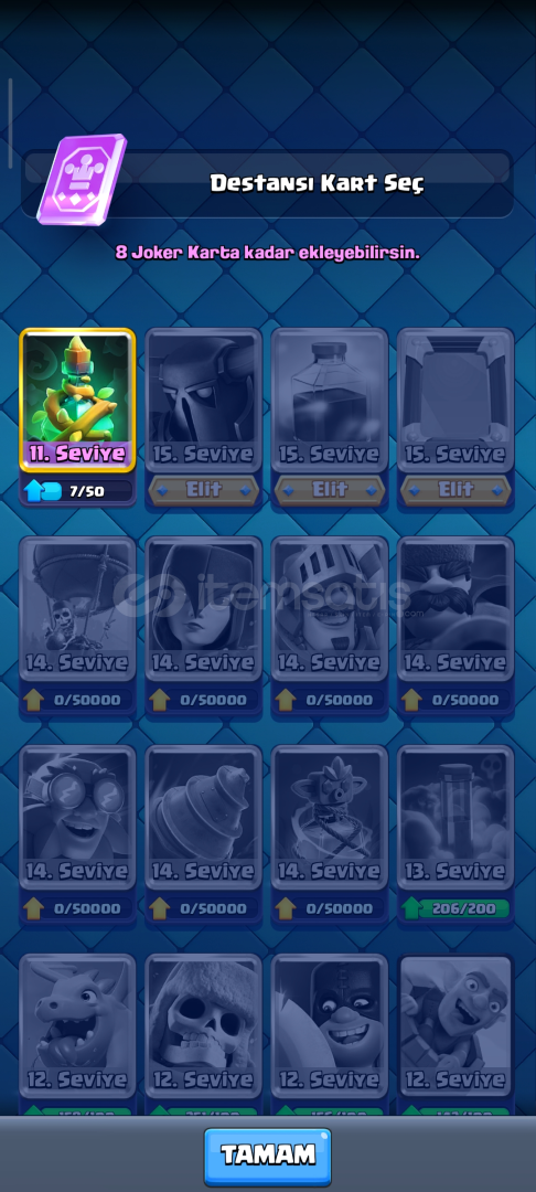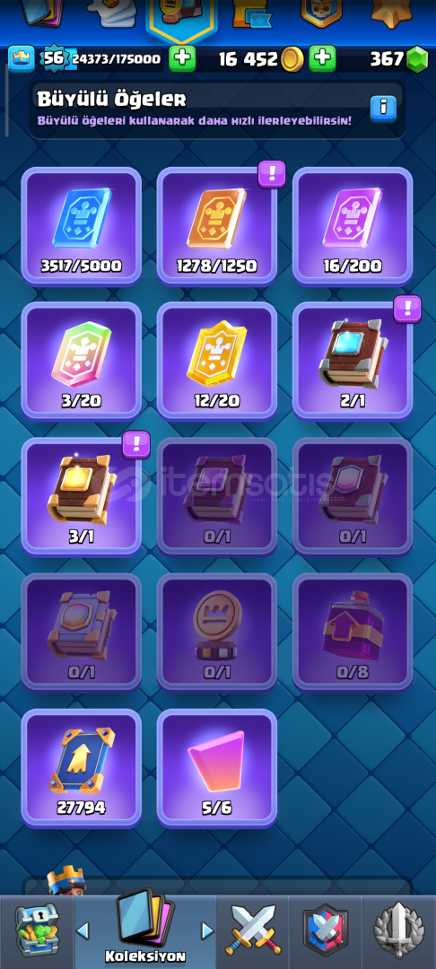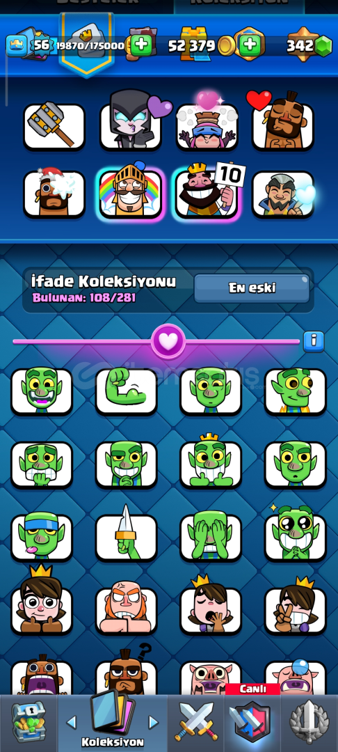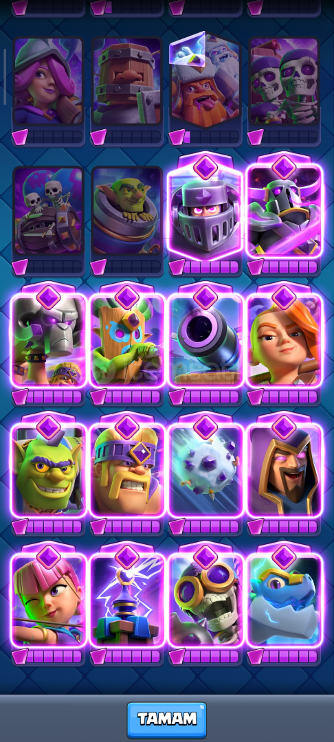 15 bin kupa 56 lvl, 10 tane 15 lvl kart kart, 9 yıllık hesap, 14 tane Evrim, 2 tane yarım açılmamış Evrim, 3 tane Ender, 2 tane sıradan kitap var 25k elit kart var, çoğu kartlar level yükseltilebilir, 108 emojisi var, eski pass royale var ve eski emojiler var pass ve diğer etkinliklerden gelen kule desenleride var.