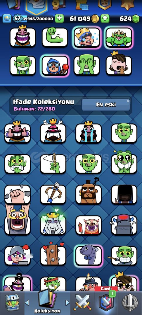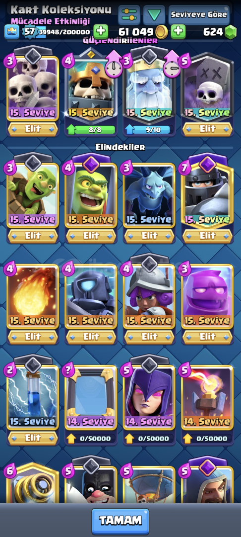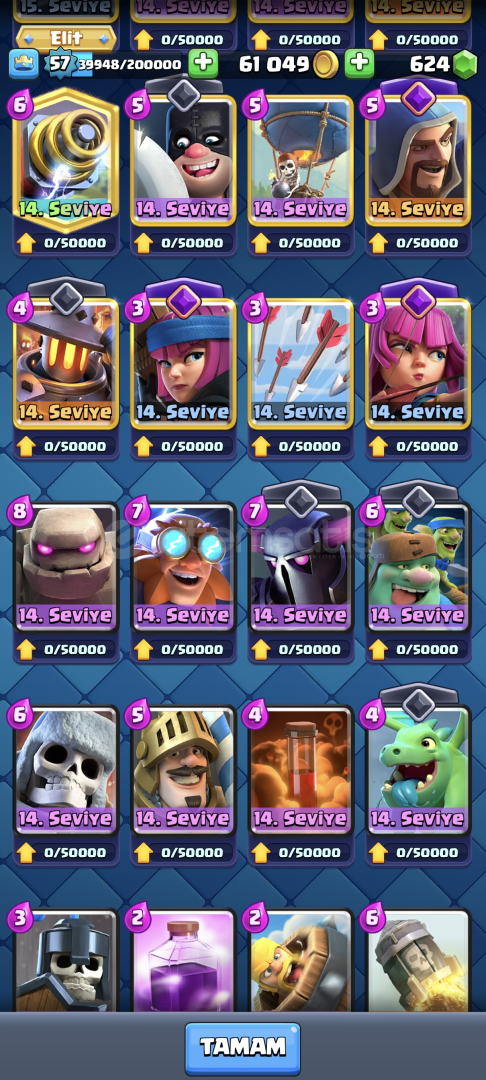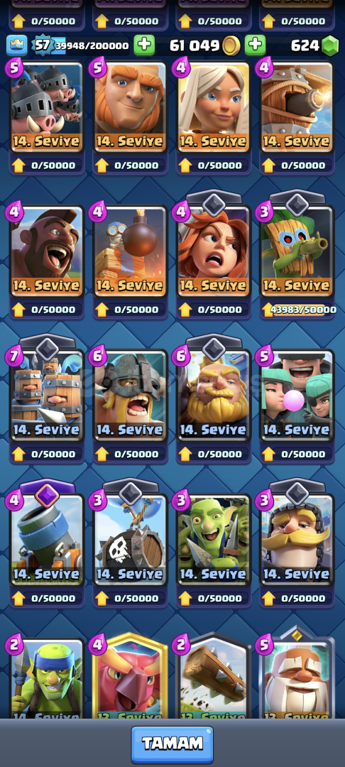 Hesaptaki her şey fotoğraflarda vardır 14 seviyeye yükseltecek kadar tum kartlar nerdeyse vardir para kasarsaniz xp 60 a kadar çıkar mega şövalye destesi maxdır 7 evrimdir pazarlık yapılır