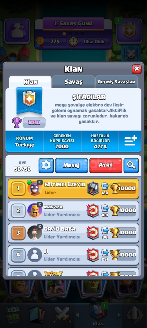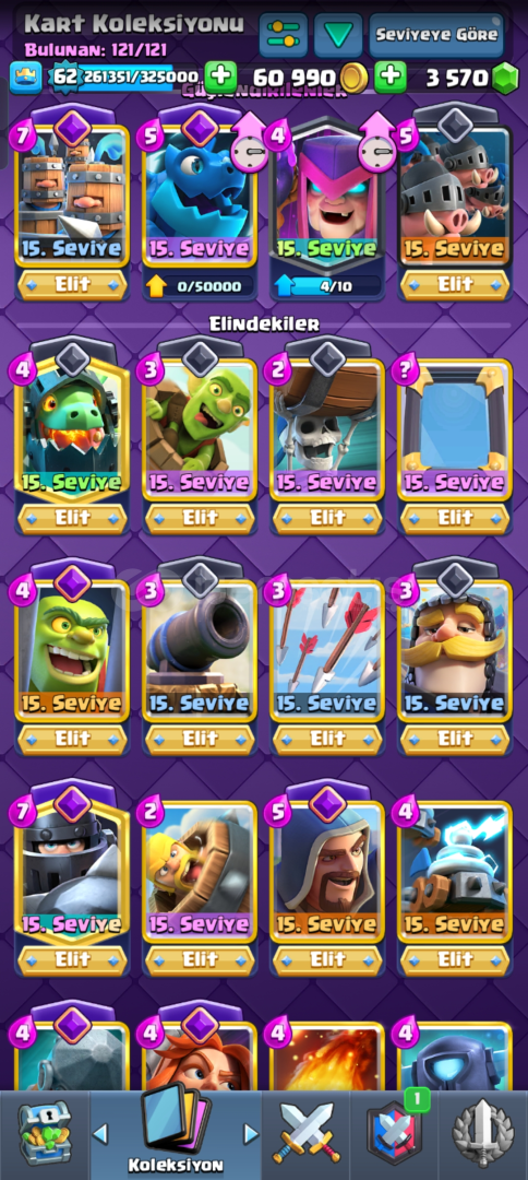 15k kupa nihai rahatlıkla gördüğüm 110 tane 14+ kart 34 tane elit 2 elit kule birliği 50 kişilik aktif klan lideri 100000 elit kart ayırdım alan kişi istediğini yükseltsin diye