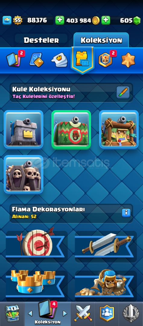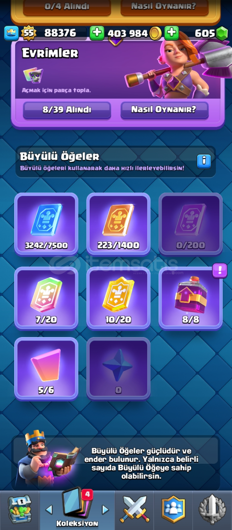 Kasım ayinda 15k kupa rozeti alınmışşuanda 10k8 evrimli(valkur, goblin kafesi, duvar yikici, bombaci, fiskeci,tesla,avci)klasik mezarlik destesi iyi seviyede oynanabiliracil satılık