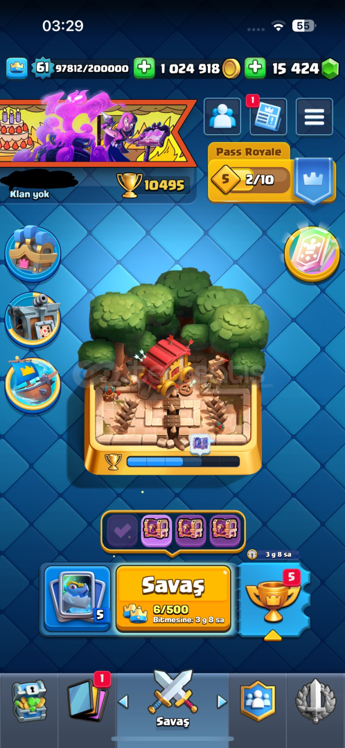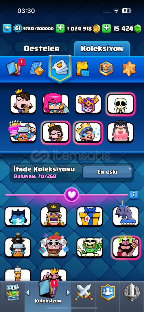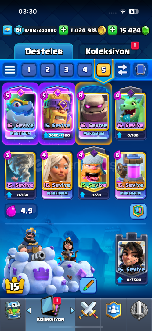 Hesapta 15K TAŞ (ELMAS) var. 9 tane kule görünümü var 1 tanesi evrimler ilk geldiğinde SINIRLI SÜRE SATILAN 1000 TAŞLIK Karlı Kule görünümü (artık satılmıyor sadece o dönemde birkaç haftalığına gelmişti.). Önceden nihaiye ulaştı fakat bu 15 bin kupa güncellemesinden sonra pek girmedim. 9 evrimli kart var. Eski hesap.