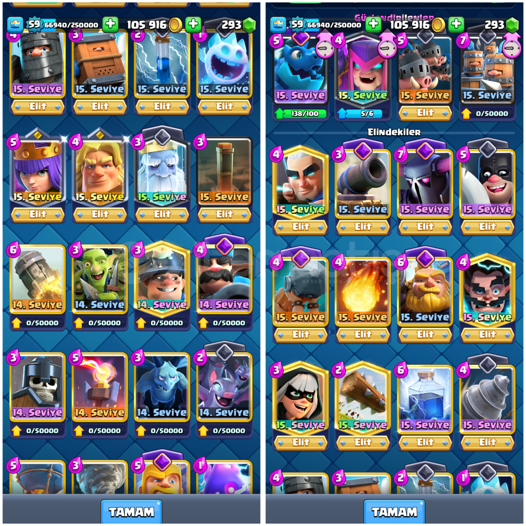 (Geri kalan tüm kartlar 13-12 seviye bandındadır envanterdeki jetonlarla istenilen seviyeye anında yükseltilebilir.)