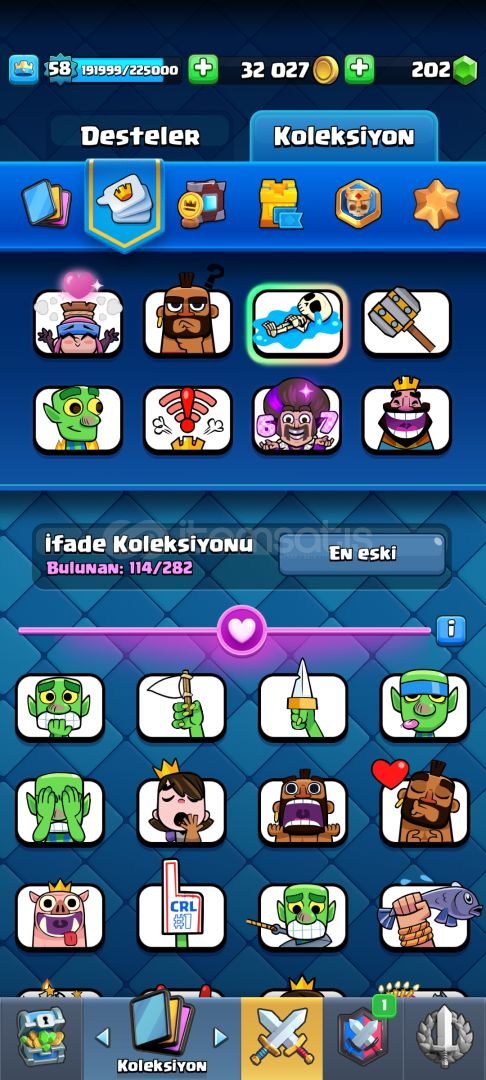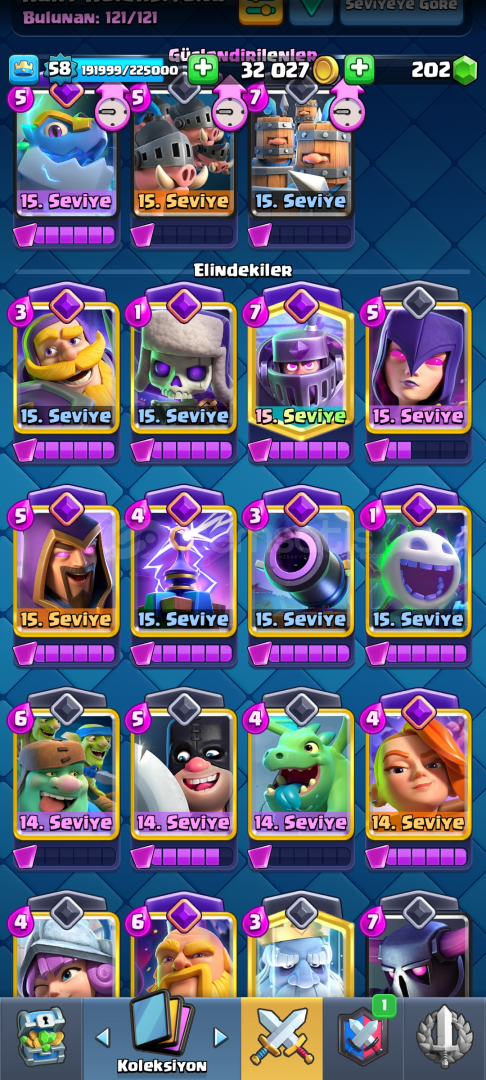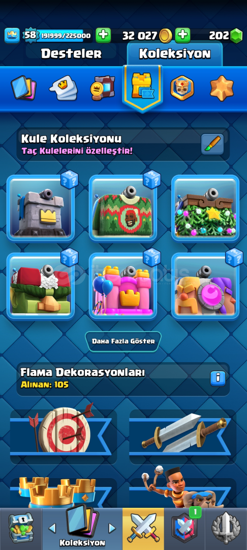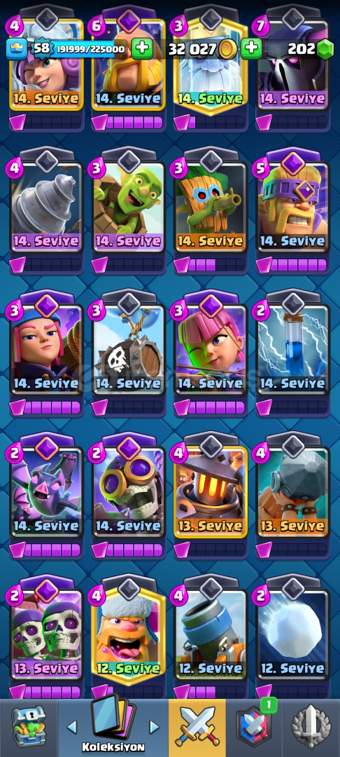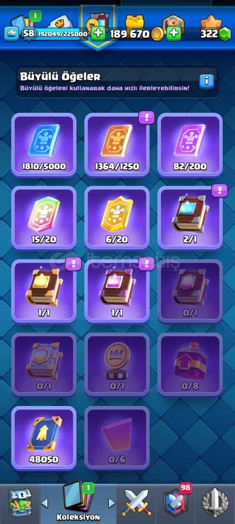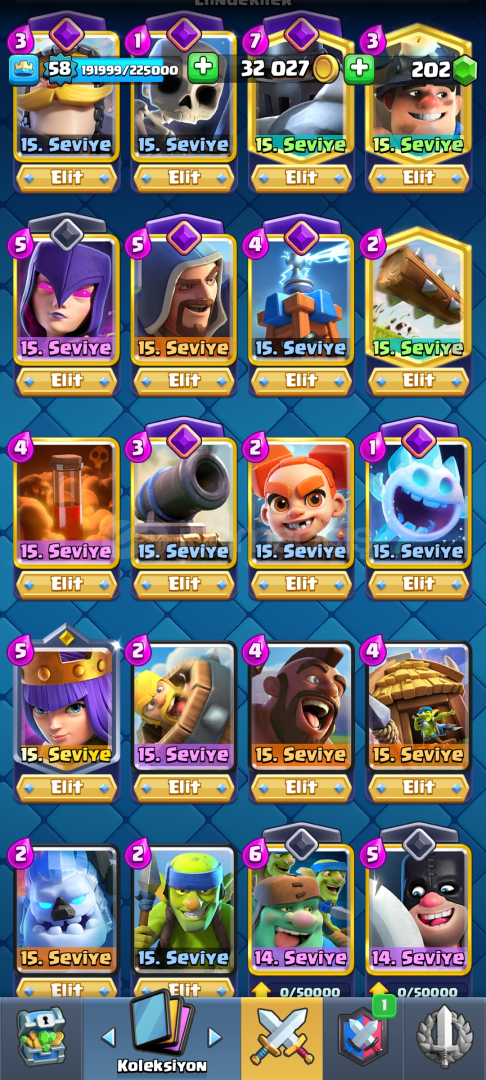 18 ELİT KART46 14 SEVİYE KART16 EVRİM (bazı kartların evrim parçaları bulunuyor)114 EMOJİ 105 FLAMA 6 KULE G...