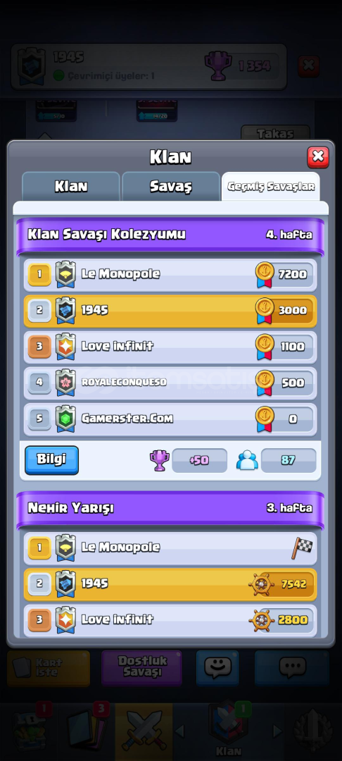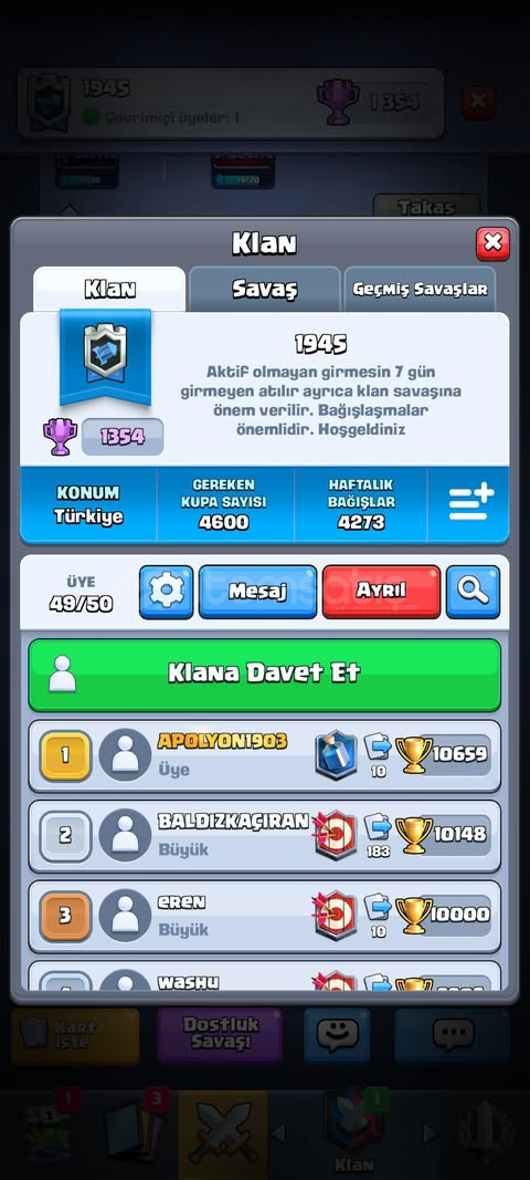 50 kişilik 1354 kupalı 4600 kupa aşşağı kimse olmayan bu klanı satmaya karar verdik. Klan 2023' te kurulmuş ol...