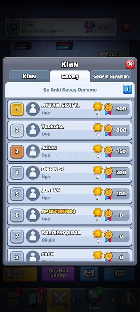 50 kişilik 1354 kupalı 4600 kupa aşşağı kimse olmayan bu klanı satmaya karar verdik. Klan 2023' te kurulmuş olup sürekli aktif tutulmaktadır.