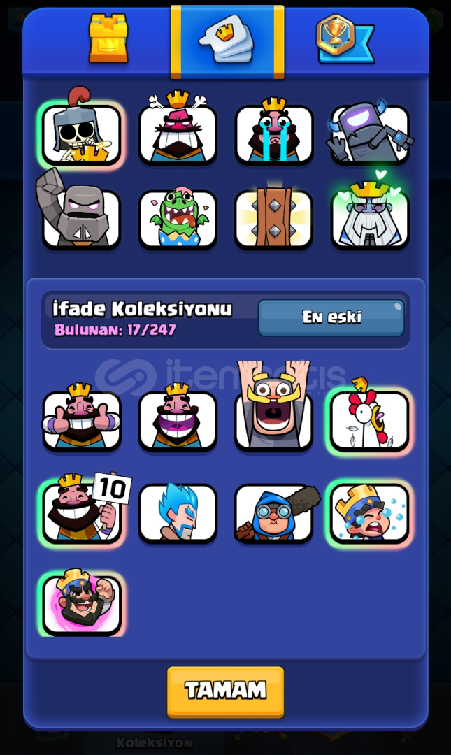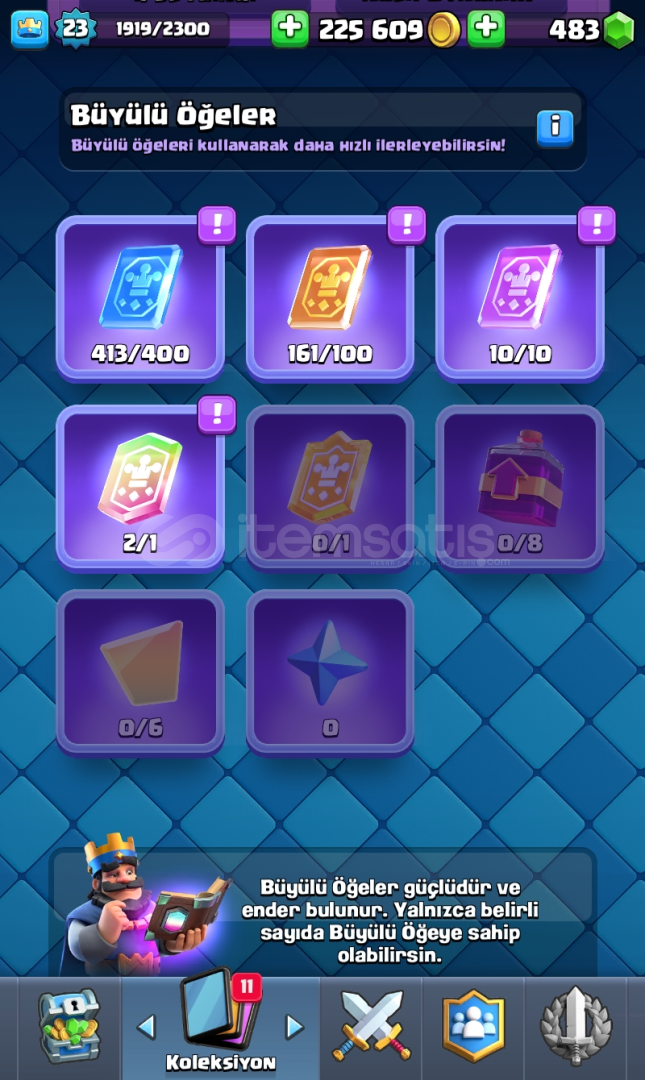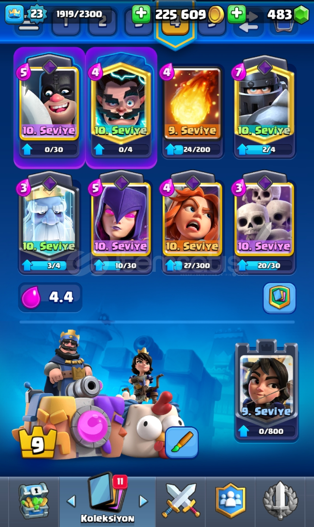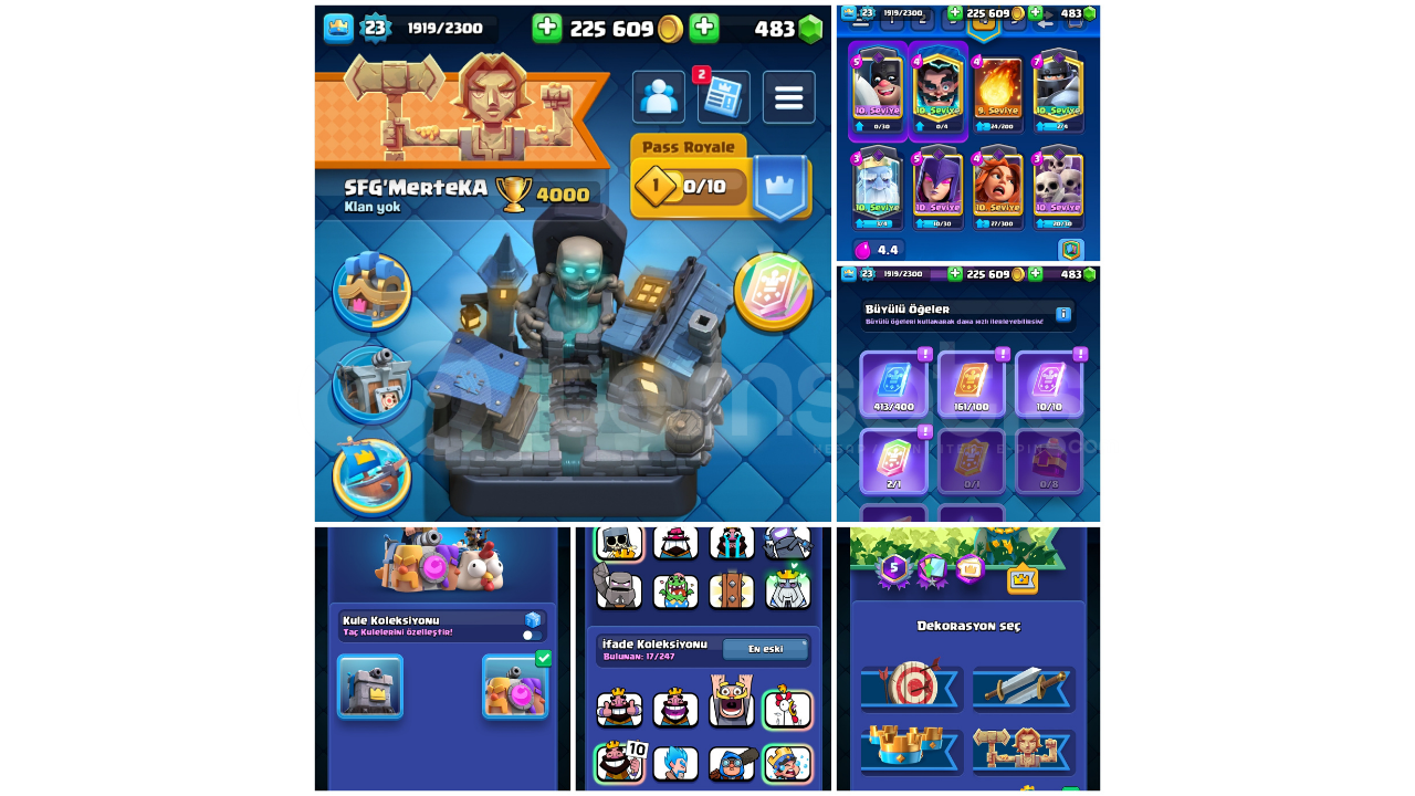 CLASH ROYALE: kraliyet hayaleti (fotoğrafta 10 level ama 11 levele yükselttim) , mega ş ,cadıivalkür,elektro büyücü,cellat,çarpma 10 lvl. prenses,madenci,oduncu,koç b,buz b ,cehennem e,kıvılcım, tomruk,haydut,mezarlık, tazı efsanevi olarak bunlar var. kule prensesi 9, kraliyet aşçısı 9, hançer düşesi 9 , 6 flama,5 çerçeve. 5yıl oynandı rozeti var. 200 bin altın var, 500 taş var. heasp 24 level.