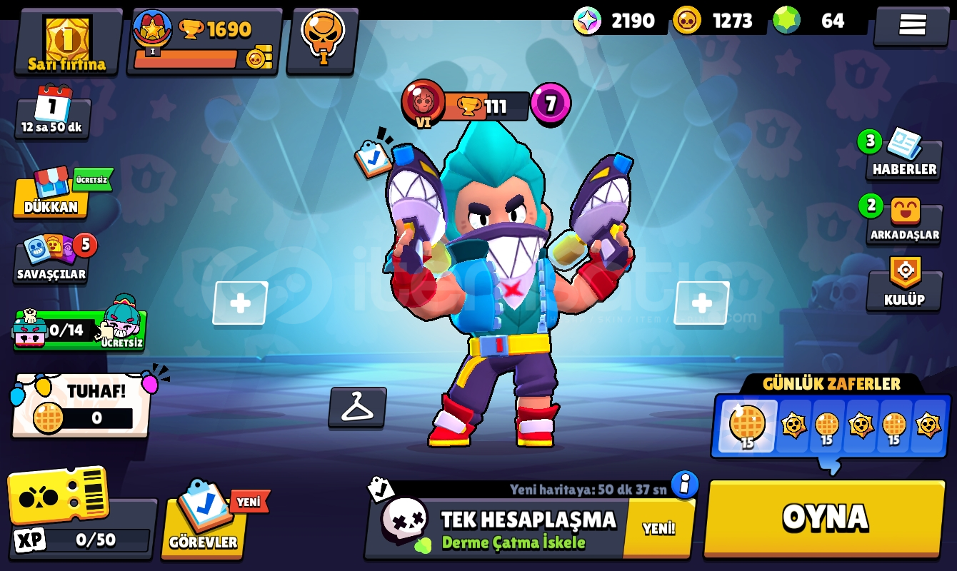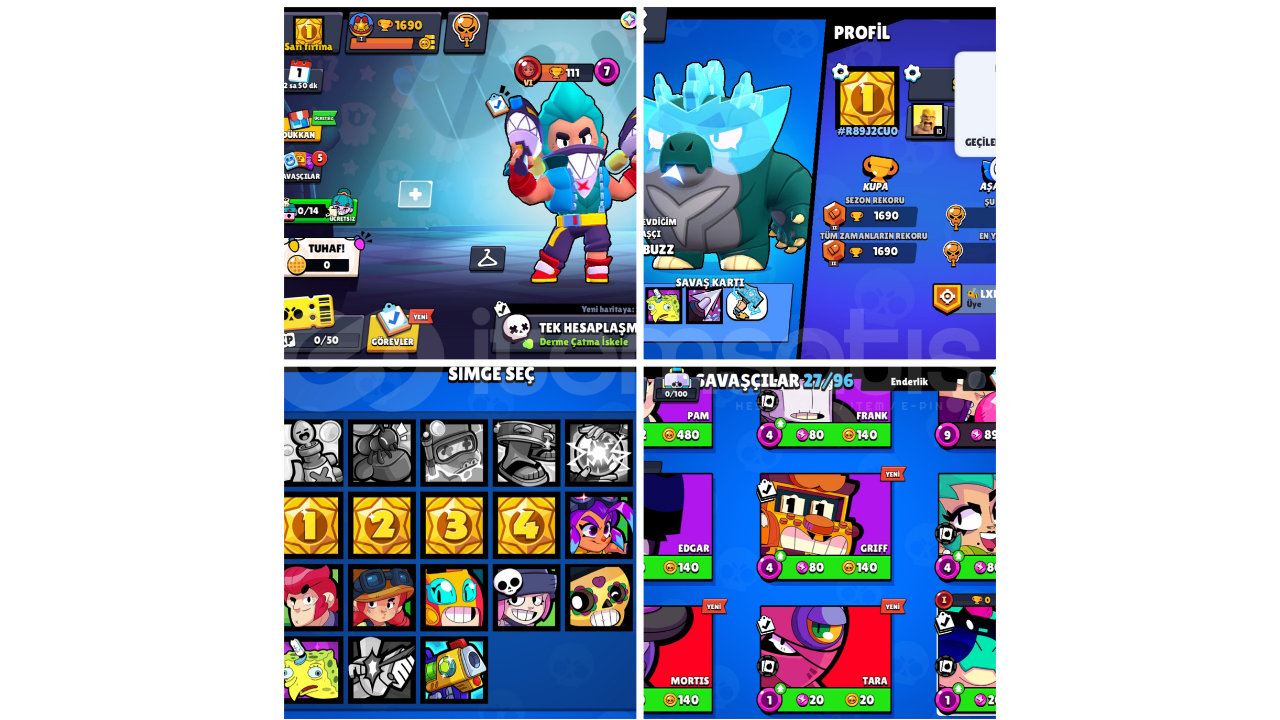 mortis sahilde, buzz godzilla,kaıju . önemli karakterler: buzz,mortis,tara destansıları saymıyorum 6 tane. extra: 64 taş, 1273 altın var, 1 yıllık simge var. ( bu simge az sayıda nadir bir simgedir, çoğu hesapta yoktur, nadir hesaplardan biri) isim değiştrme ücretsiz