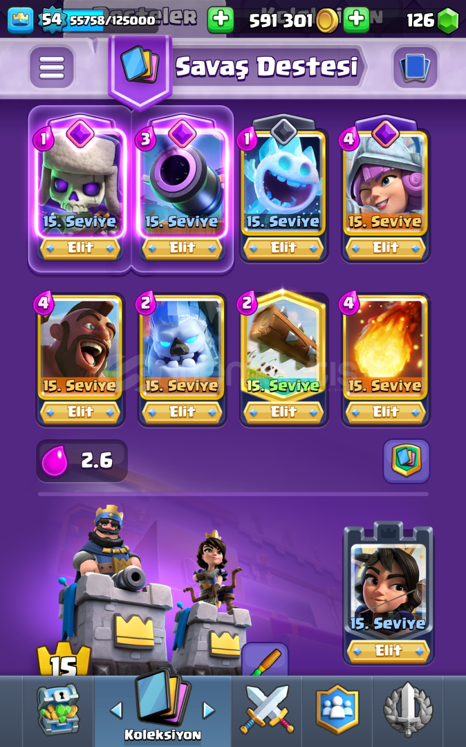 Hesap 15k kupadır.Nihai şampiyon olmasına son bir rütbe kaldı.2.6 destesi ve kule prensesi elit 15 max seviyededir.Hesabı sadece profesyonel küresel 2.6 oyuncuları alabilir. Detaylar görsellerde :
