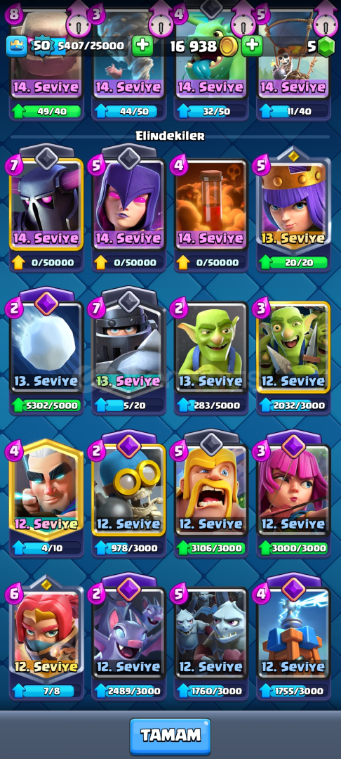 4 elit kart8 evrim11k kupagüçlü madenci ve küçük prens dışında bütün kartlar açıktırElit kartlar:domuz binicisi,top,silahşör,tomrukevrimler:kartopu,yarasalar,tesla,elektro ejderha,okçular,top,büyücü