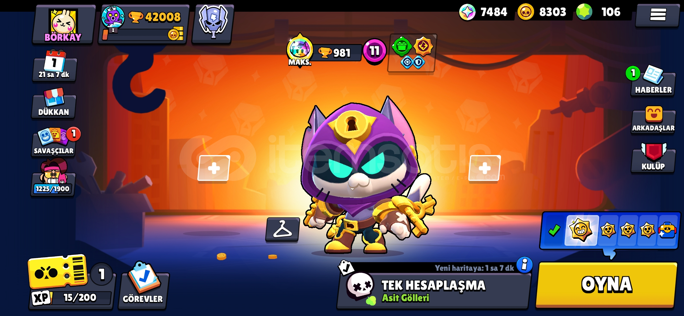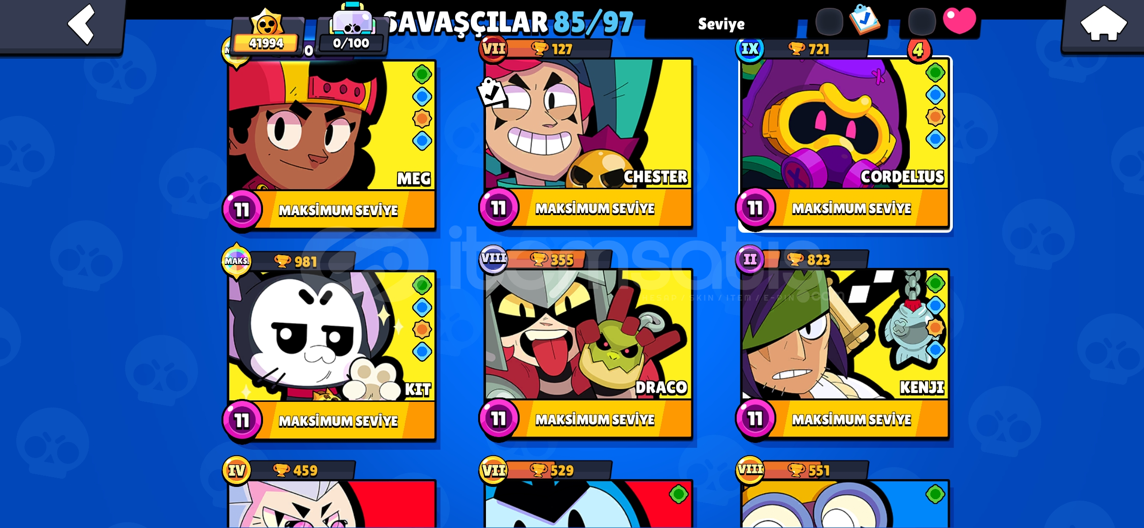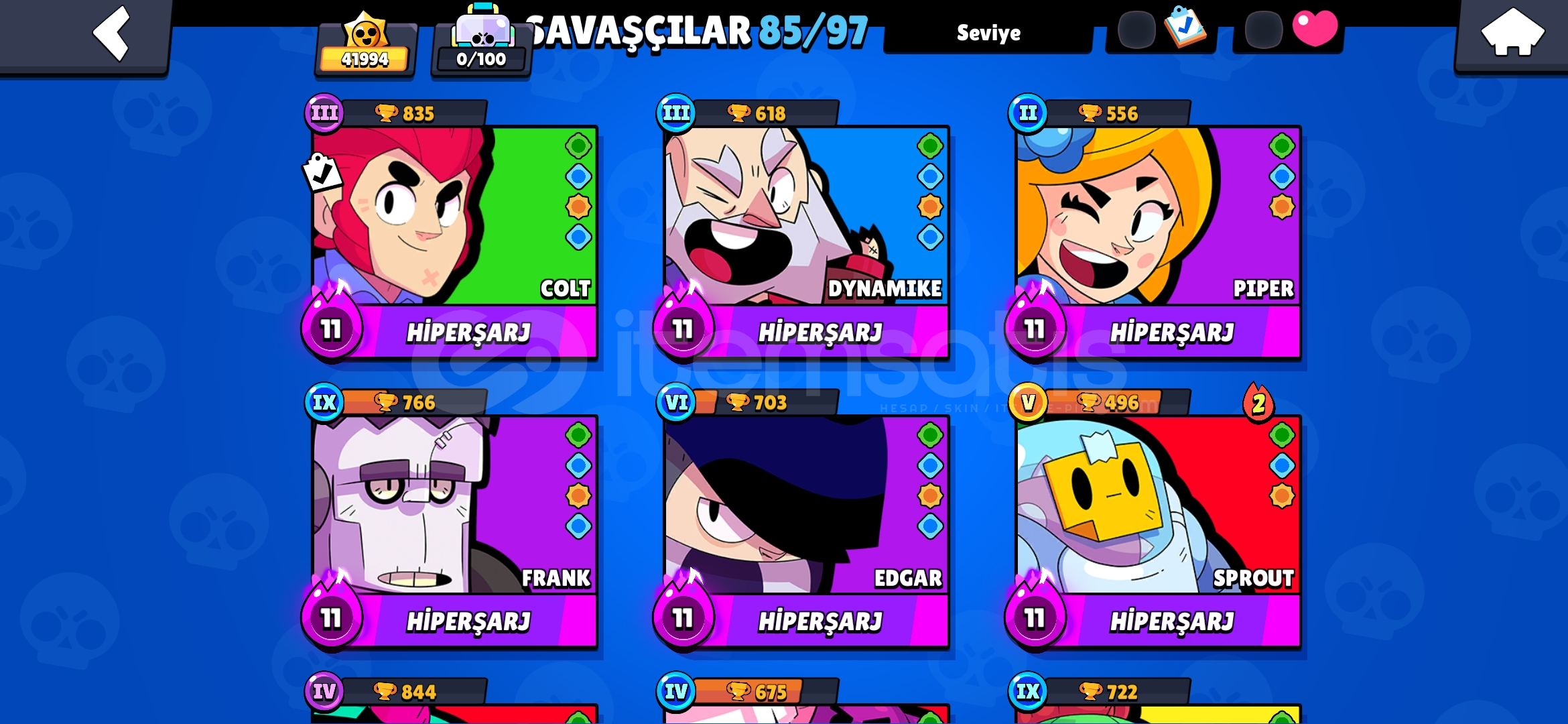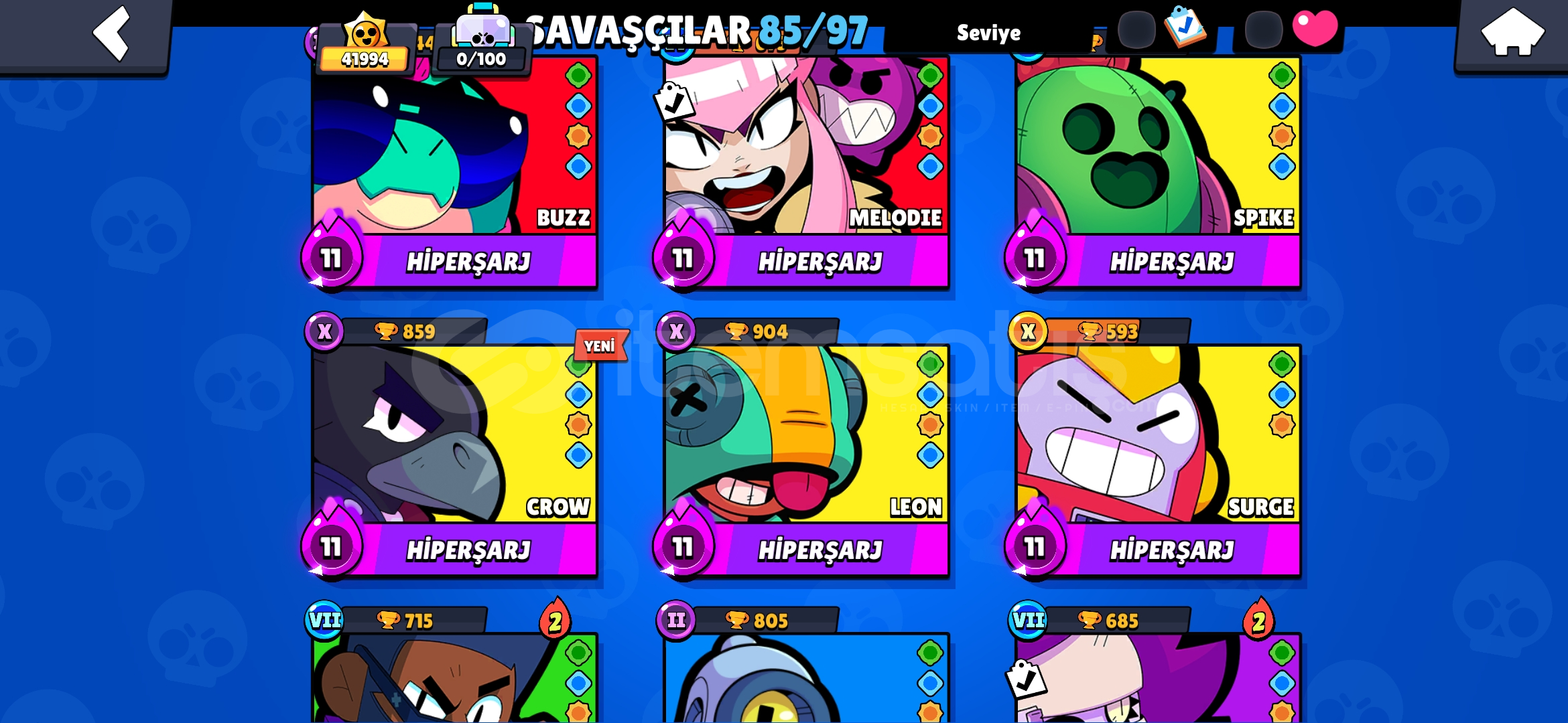 Brawl stars: 42000+ kupa 12 hipersarj karakter 30 son seviye karakter sayısız leon, cat, spike skini