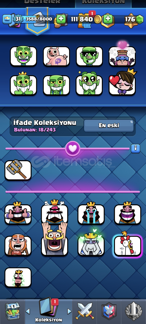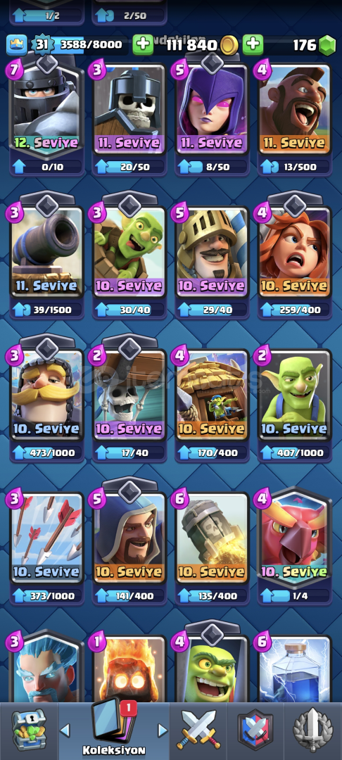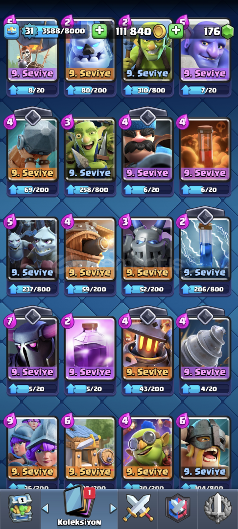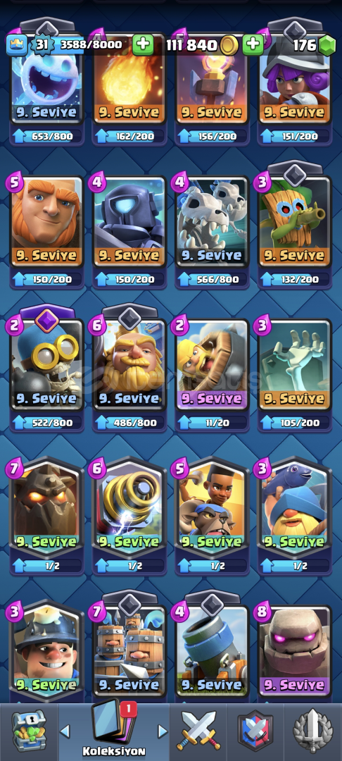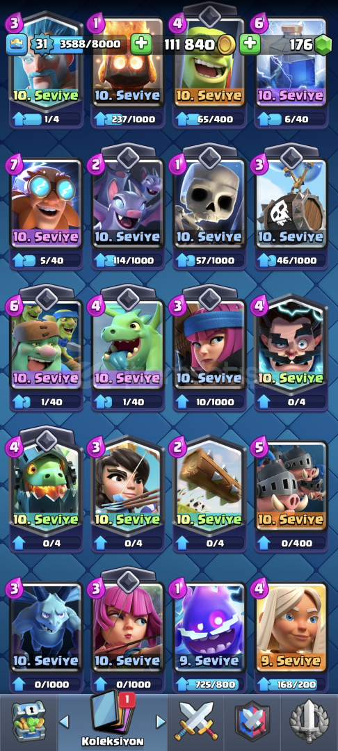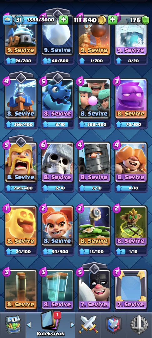 •Hesap 31 Seviyedir•Kart Seviyeleri Yüksektir•Kasıp Satmaya Uygundur•5126 Kupa•Çoğu Değerli Emoji Var