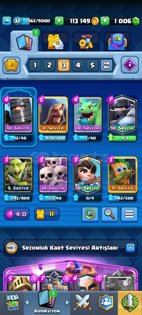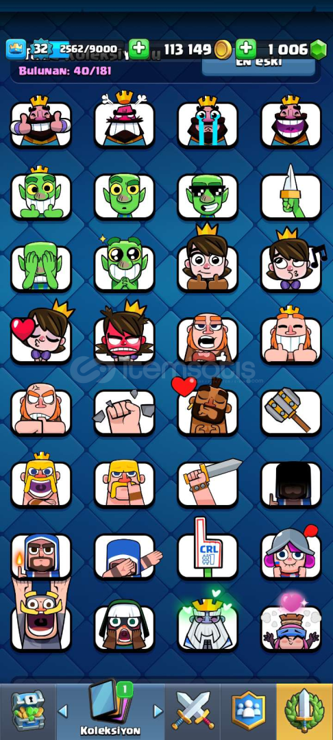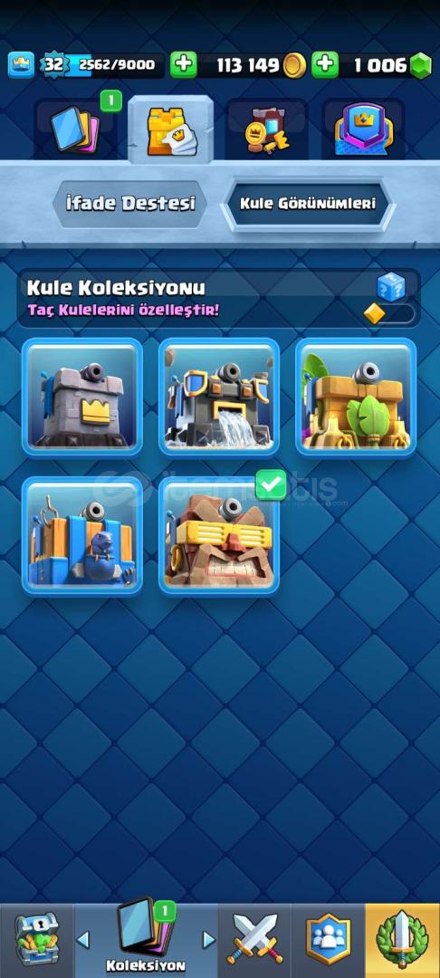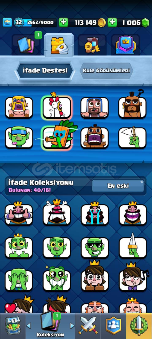 Hesapta 1006 gem, 113k altın, 4008 kupa, 40 ifade, 5 kule görünümü ve 102 kart bulunmaktadır.