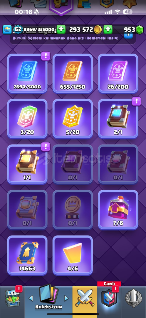 Hesabımız 62 Seviyedir.Hesap 15.000 Kupadır.Oyunda Bulunan 36 Evrimden 33 Evrim Açıktır. (Yavru Ejderha-İskelet Ordusu-Kraliyet Domuzları Evrimleri Yoktur.)32 Kart Elit Seviyedir.74 Kart 14 Seviyedir.15 Kart 13 Seviyedir.Nadir Emojiler Satın Alınmıştır. (154 Emoji Bulunmaktadır.)Hesap Koruması Açık Değildir.Değerinde Fiyat Teklifleri Değerlendirilir.Alıcısına Hayırlı O...