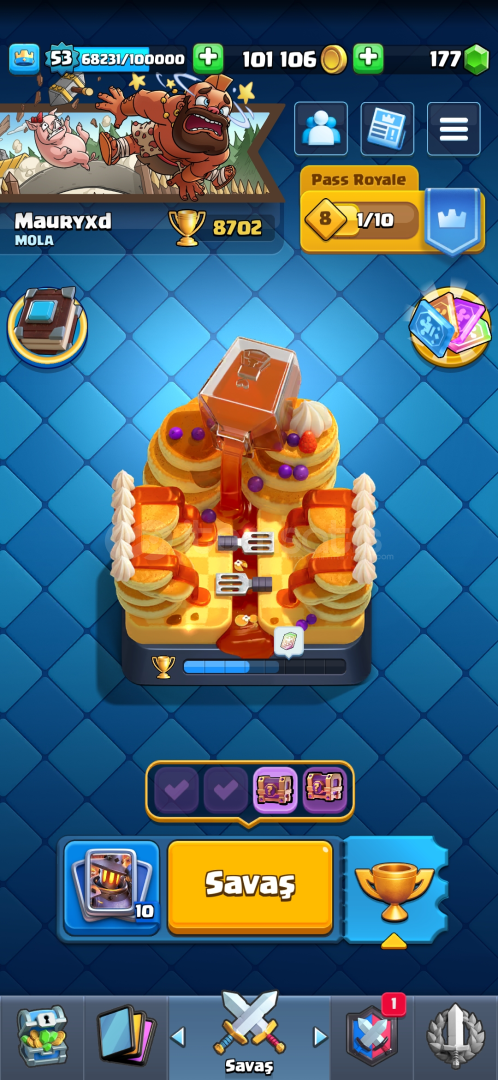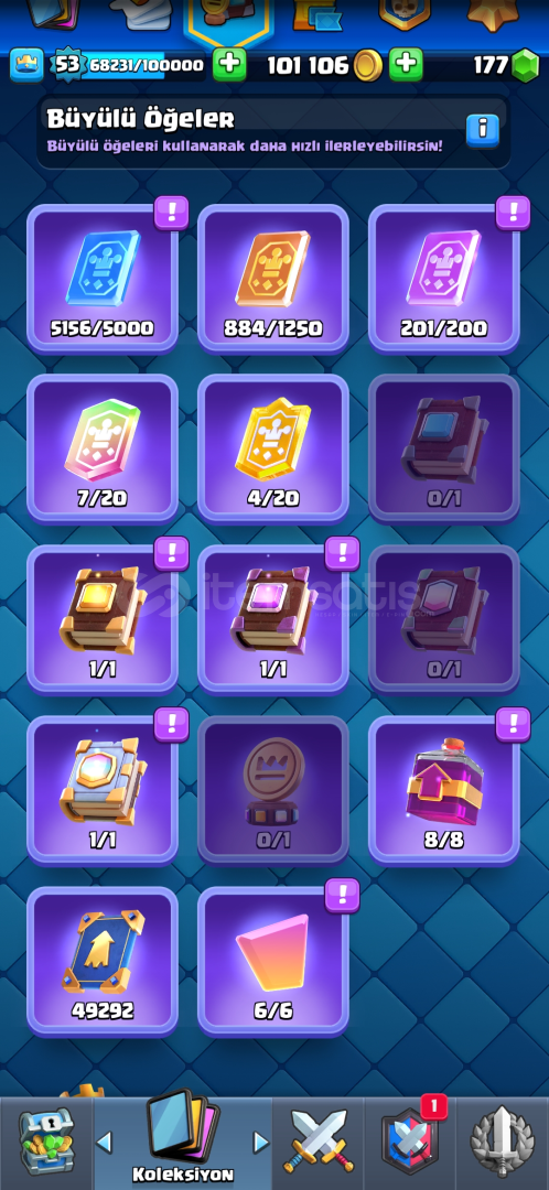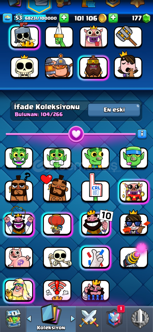 50 tane 14 seviye kart104 emoji nadir emojilerde vardır6 tane evrim parçasıOkçu.elektro ejder,Tesla, Fişekçi evrimleri açıkHesabı incelemek için https://royaleapi.com/player/P0L9UQP2G?lang=en