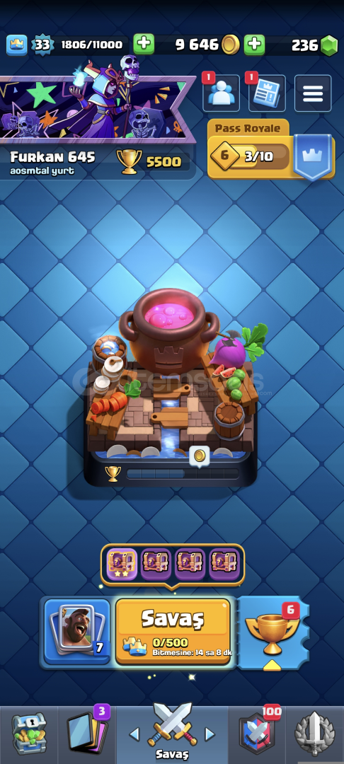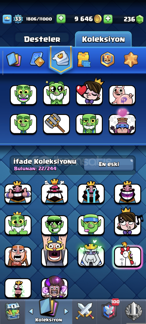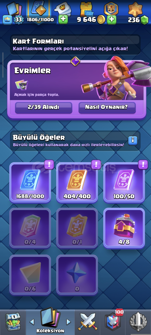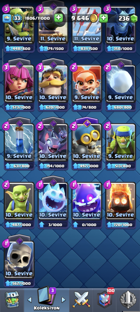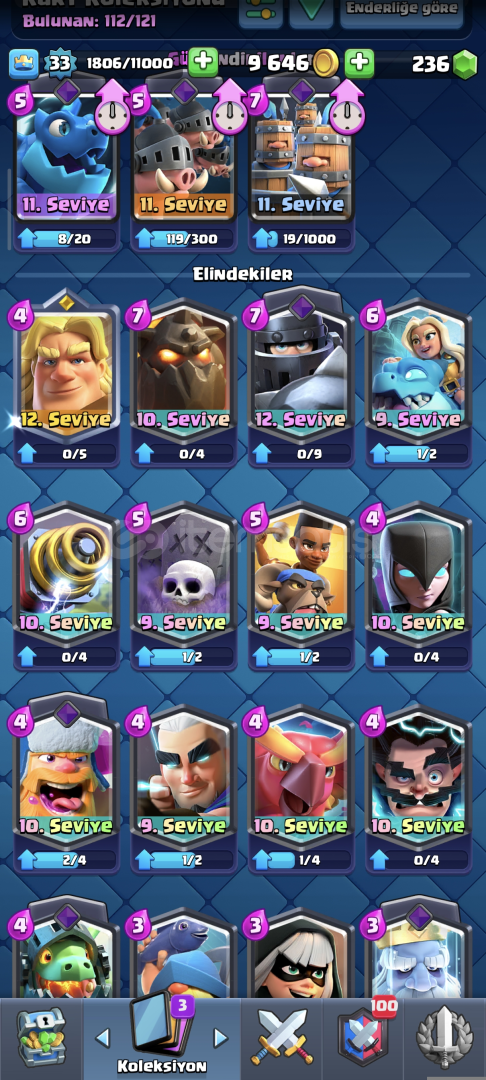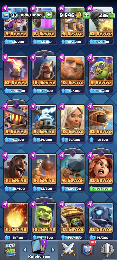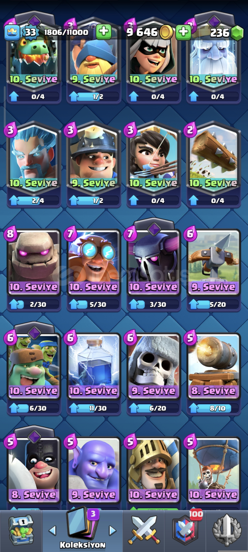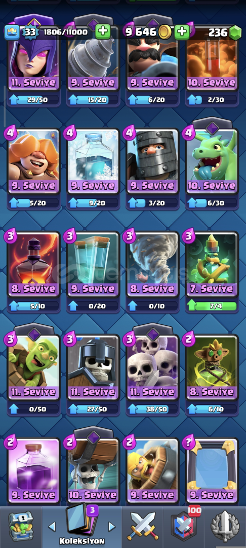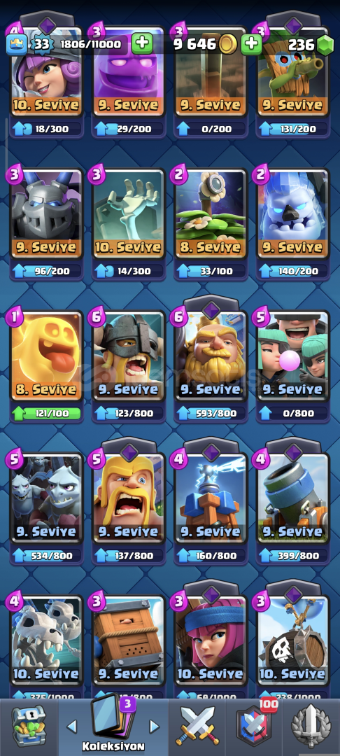 •5500 Kupa•33 Seviye•Çoğu kart seviyeleri yüksek•Gelişmeye açık•Mail değişen açık•Pazarlık yapılır