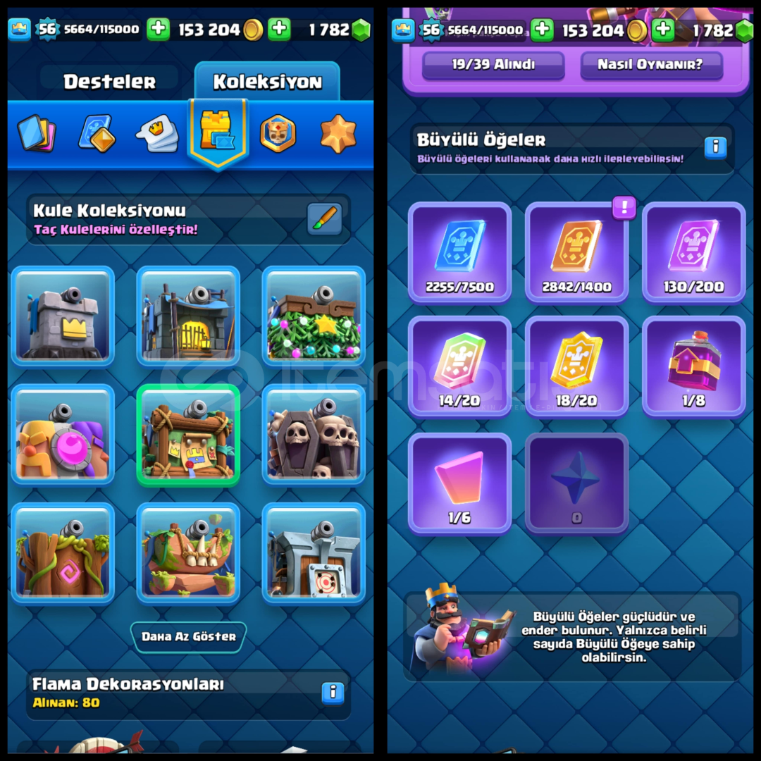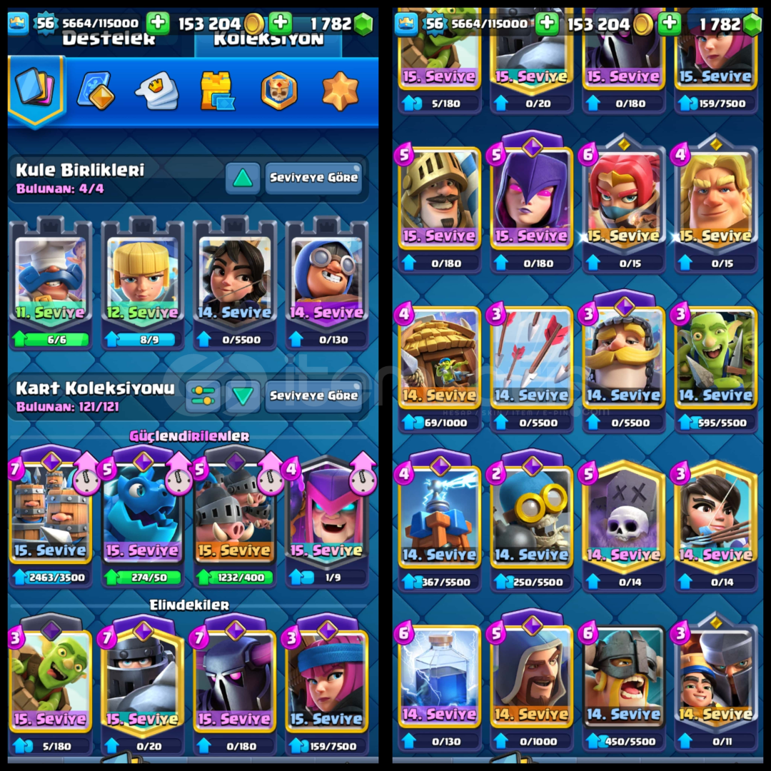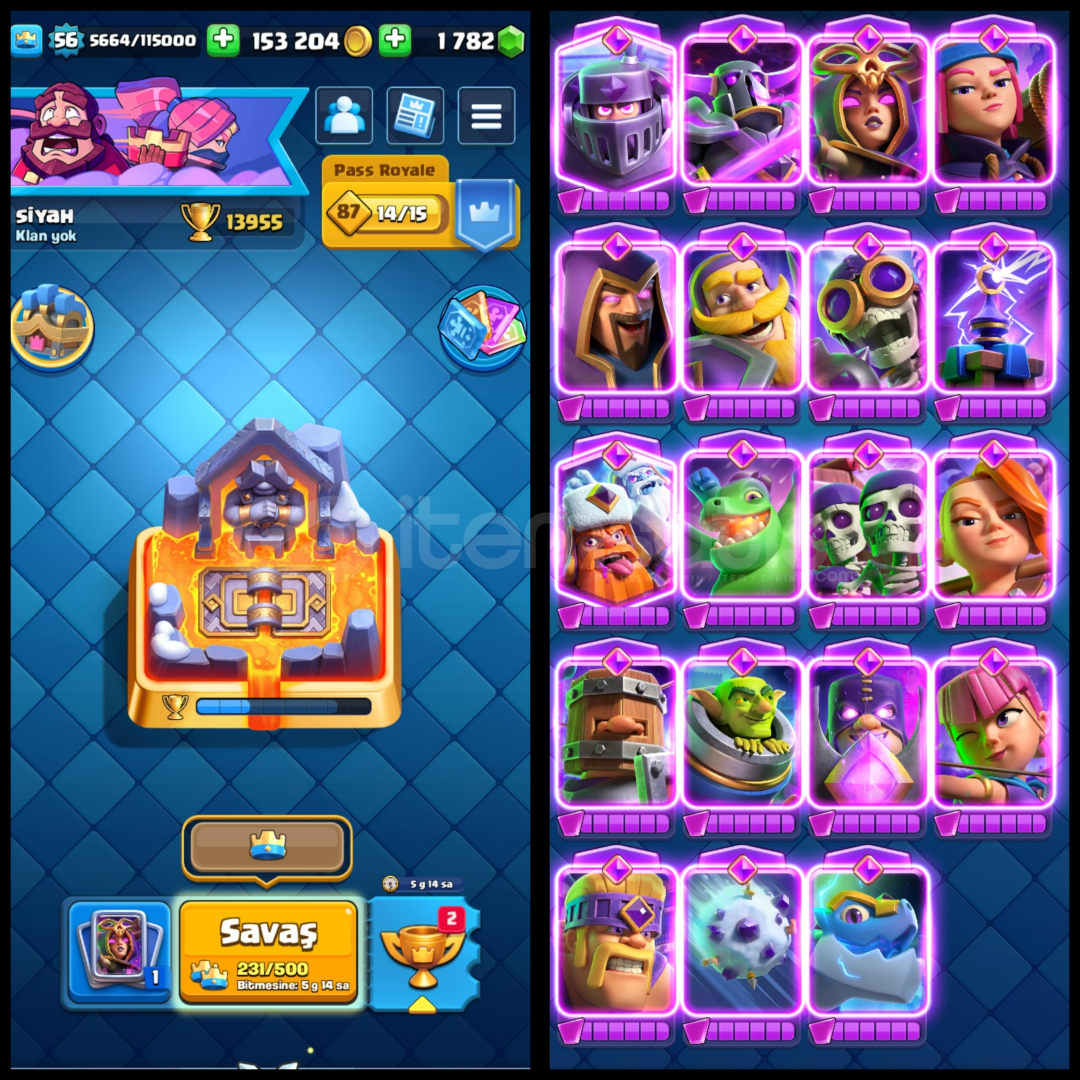 $) Öncelikle Selamünaleyküm hesap fotolarda göründügü gibidir ne bi eksik ne bi $) 56 level 14000 kupalı sahibinden hesap $) Hesapta 8 tane 15 level 20 tane 14 level kart bulunmaktadır$) 19 evrim mevcuttur diğer evrim slotlarınin 2 ve 3 parcacigi doludur her sezon 1 evrim yapabilirsiniz(Cadı,Pekka,Yavru ejder,Elektro ejder,Muhafizlar, Mega sovalye, Fişekçi, Büyücü...