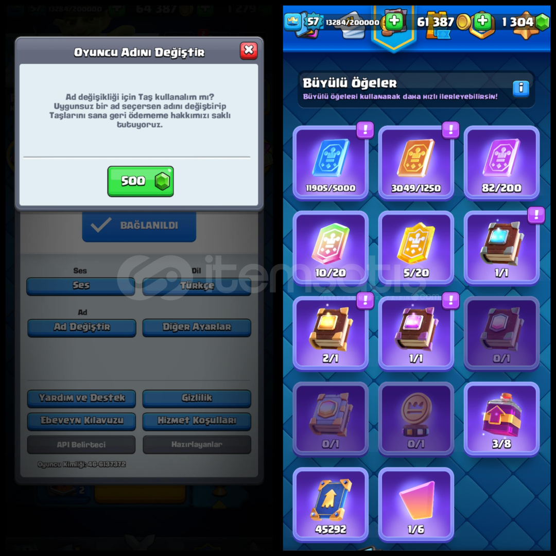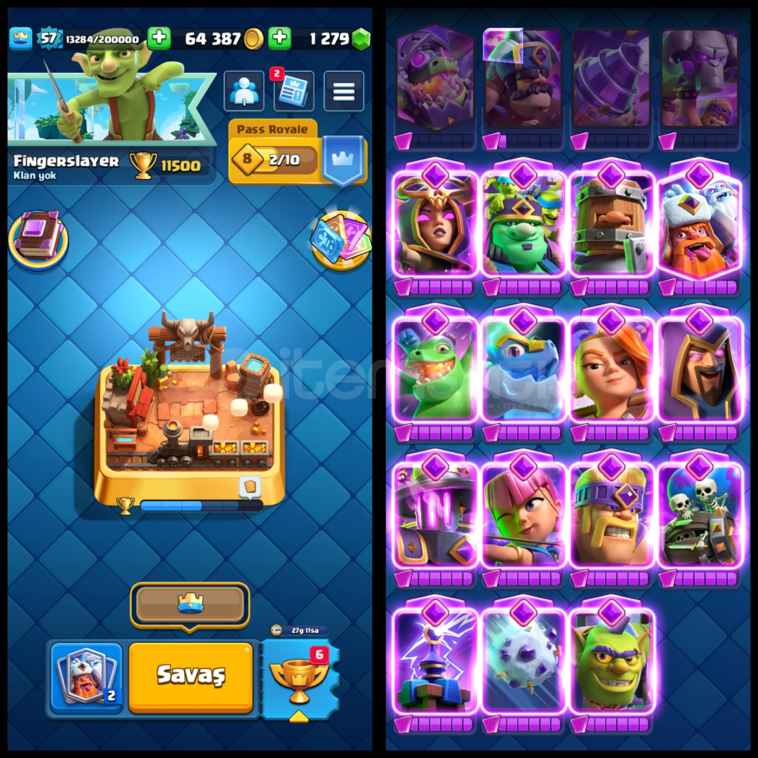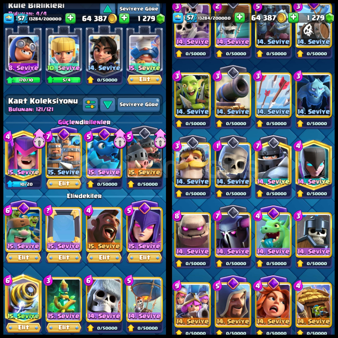 &) Öncelikle Selamünaleyküm hesap fotolarda göründügü gibidir ne bi eksik ne bi fazla &) 57 level 12000 kupalı hesap&) İsim değiştirme 500 taş tır&) 9 elit bulunur &) 70+ max mevcutturPara olmadığı için 14 level yapamıyorum 10 dan fazla 14 level yapılabilicek kart mevcuttur&) İksir golemi, Dev goblin destesi... Desteleri çoğunlukla maxtır &) 15 evrim bulunmak tadırElektro e...