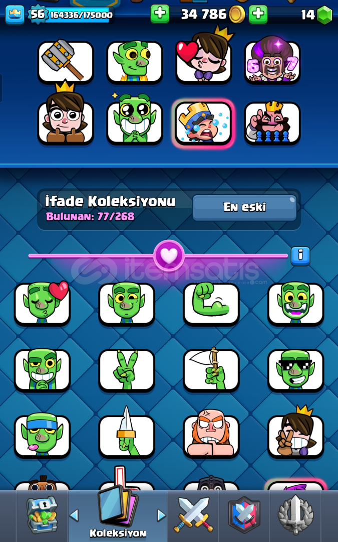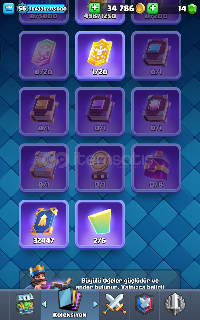🔹 Arena rozetleri, sezon kupaları ve tam gelişmiş kart koleksiyonu ile tam bir Vitrin Hesabı.