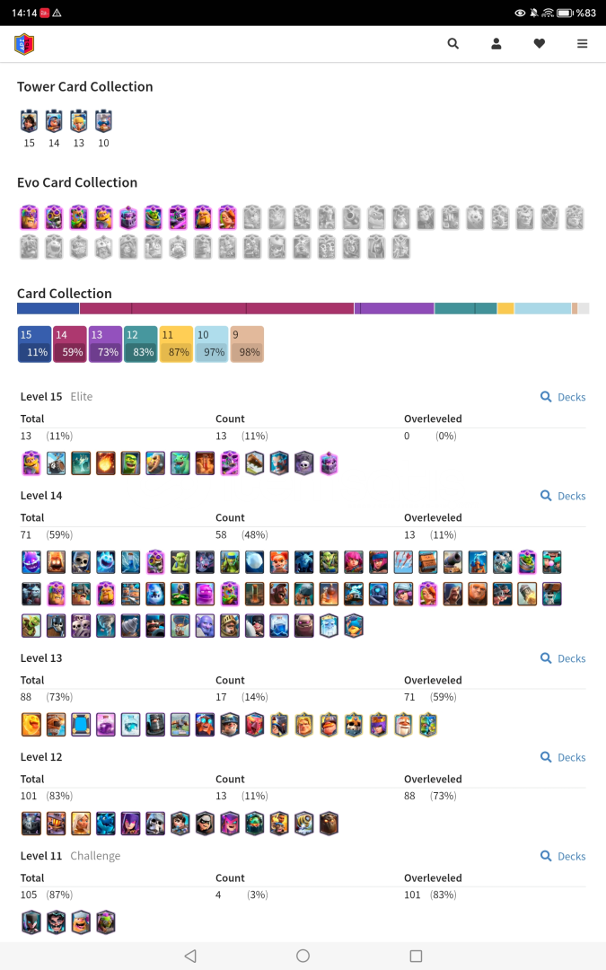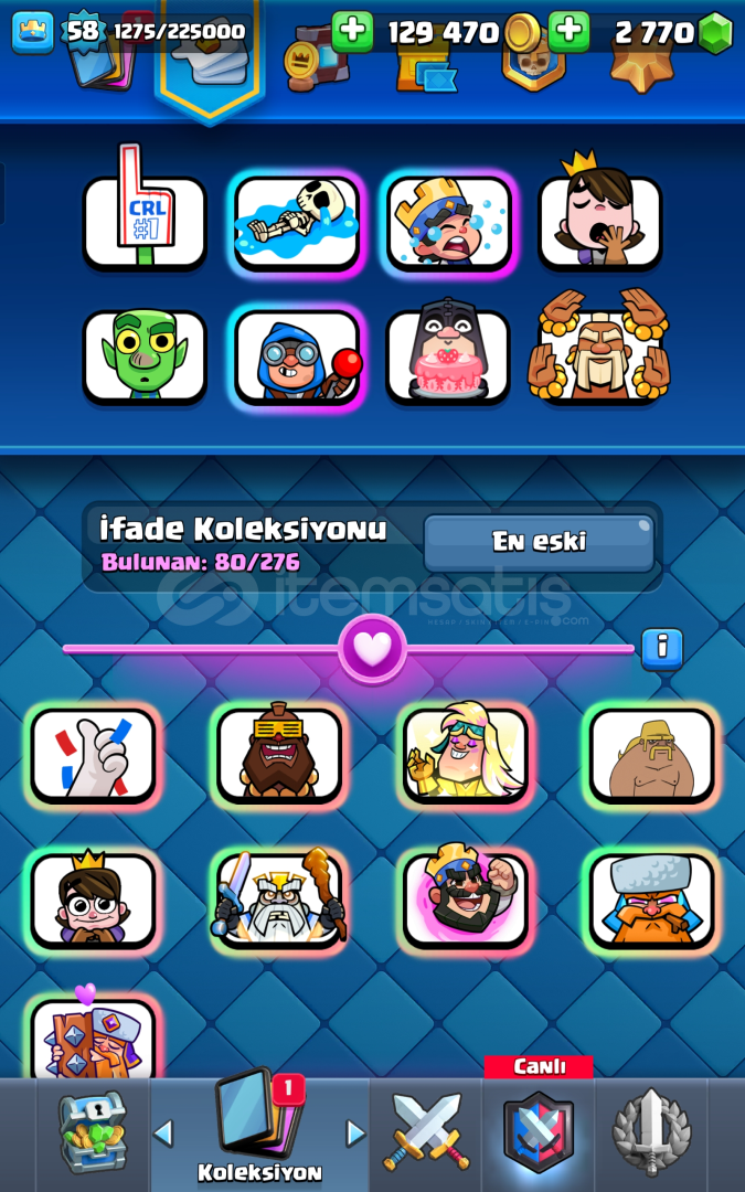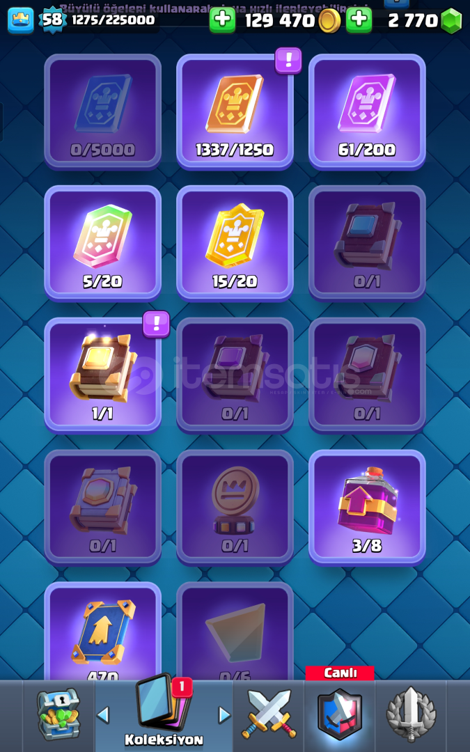 🔹 Arena rozetleri, sezon kupaları ve tam gelişmiş kart koleksiyonu ile tam bir Vitrin Hesabı.