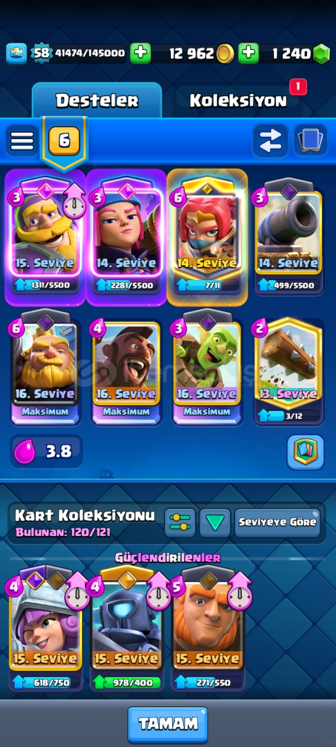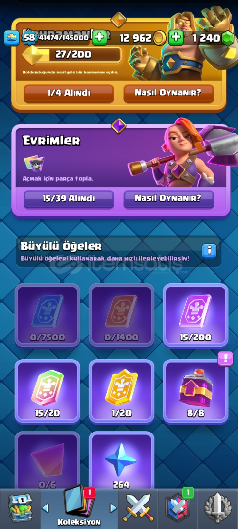 58 seviye 15 evrim max kartlı hesap