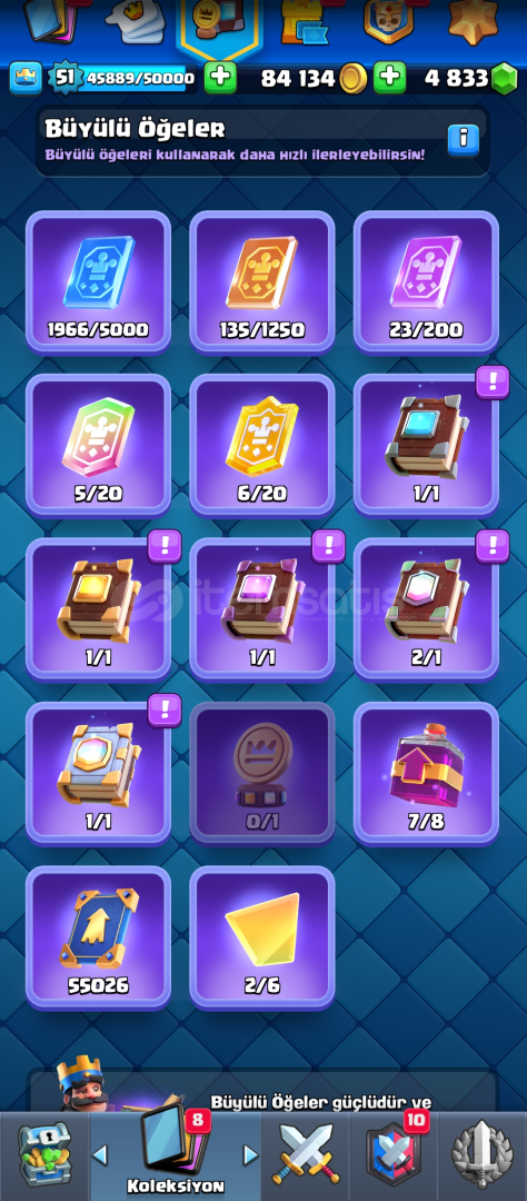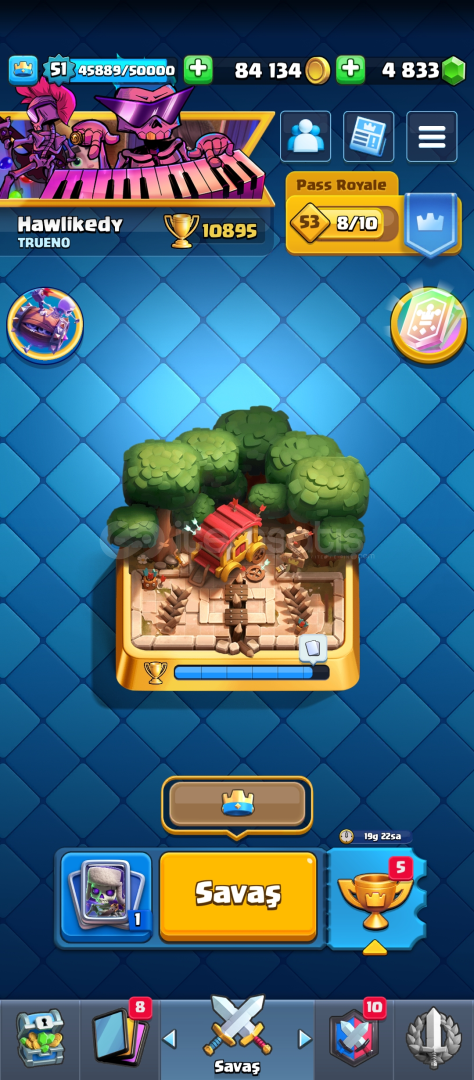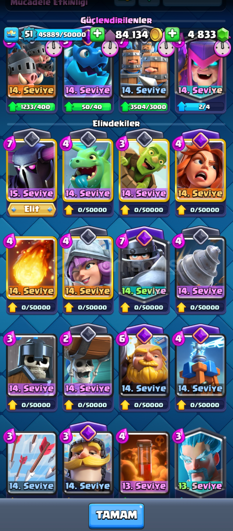 Hesap 10980 kupadır.Hesap 51 seviyedir.8 tane elit, 20 tane 14 seviye vardır. (12 tane daha kartı para basarsanız maxlayabilirsiniz.)13 tane evrim vardır: Valkür top fişekçi mega şovalye şovalye iskeletler kraliyet devi tesla elektro ejder okçu barbar havan yarasa 121/121 bütün kartlar bulunmaktadır.50 tane güzel, nadir ve toxic emoji vardır.3 tane kule görünümü vardır.38 d...