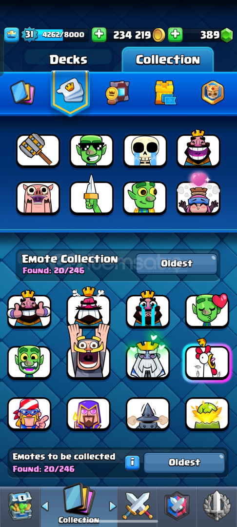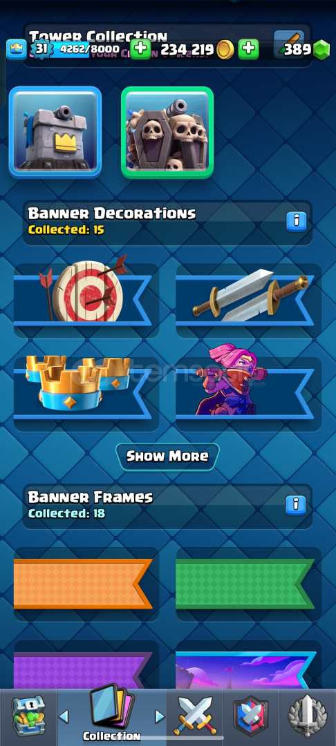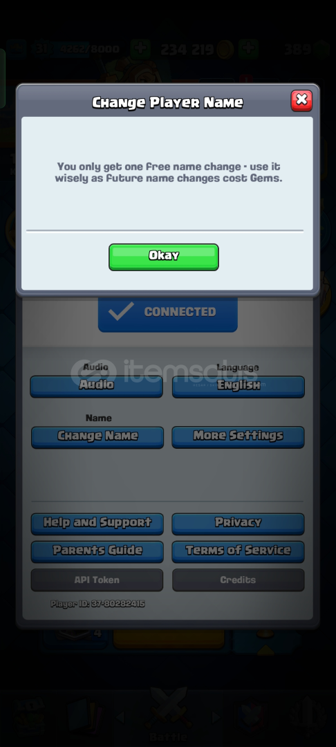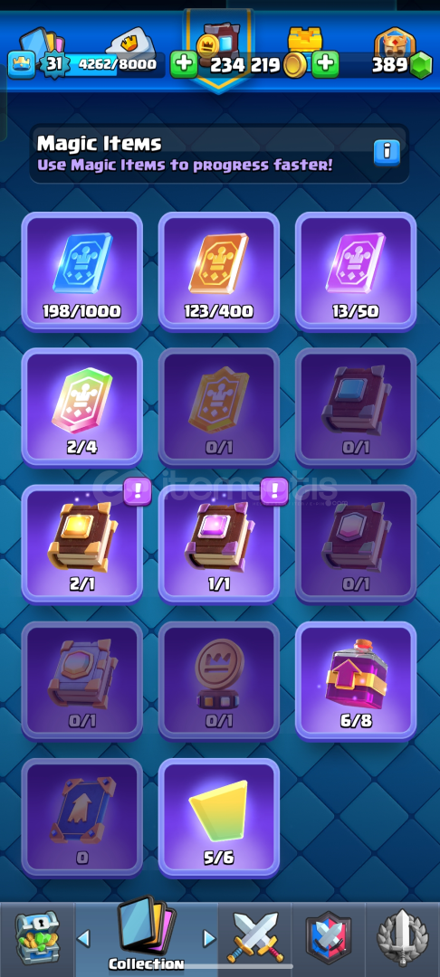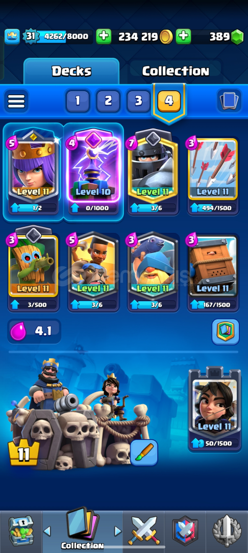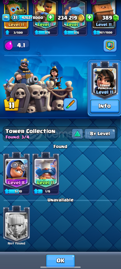 Ücretsiz isim değiştirme hakkı bulunmaktadır.6149 kupadadır.1 tane farklı kule görünümü vardır.2 Şampiyon kart vardır.(Okçu Kraliçe , İskelet Kral)5 Adet evrimi açılmış kart vardır.(Okçular,Bombacı,Elektro Ejder,Tesla ve büyücü)Envanterde 5 adet evrim parçacığı vardır.(6 tanesi bir kartı daha evrimli yapar.)Mail adresinize ...