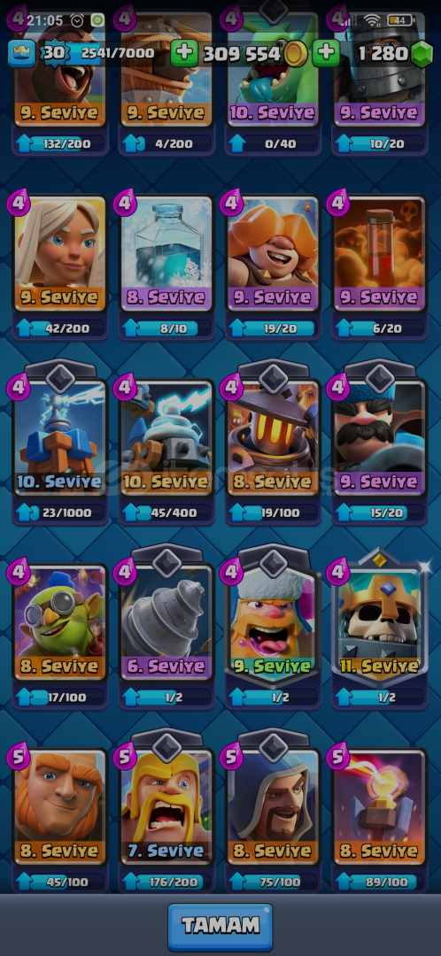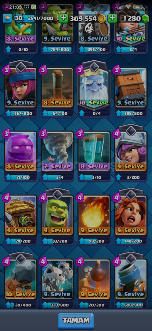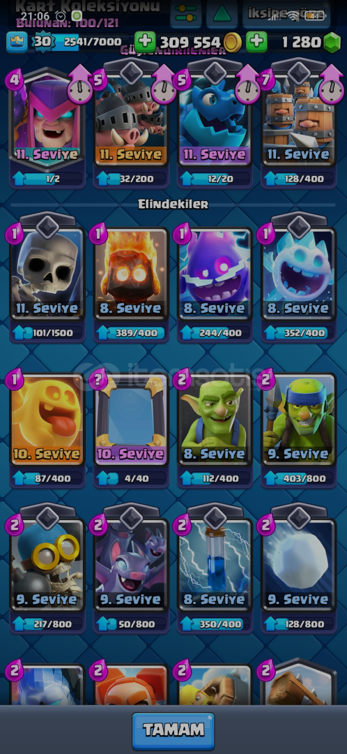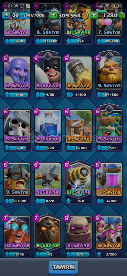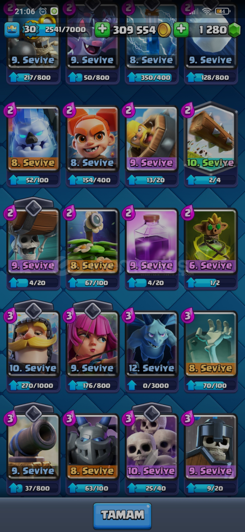 3 barbarlar 2 iskelet fıçısı 2 Kraliyet hayaleti ve full cadı + cehennem ejderi evrimi bulunmaktadır. 1280elmas 300000altın hesap 30 leveldir