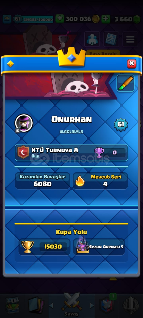 5 yıl boyunca oynadığım emek hesabım satılıktır . 19 tane evrimler 32 tane elit kartlar ve kule birlikleri dolular dolusu hesap . ayriyeten hesapta 3660 tane elmas ve +300k altın bulunmaktadır . 131 tane emoji +55k elit joker kartı 9 tane kule deseni mevcut . PAZARLIK ABARTILMAYACAK ŞEKİLDE MEVCUTTUR. hesabı incelemek isterseniz linki aşağıda veriyorum :https://royaleapi.com/player/LGCLRLYL8