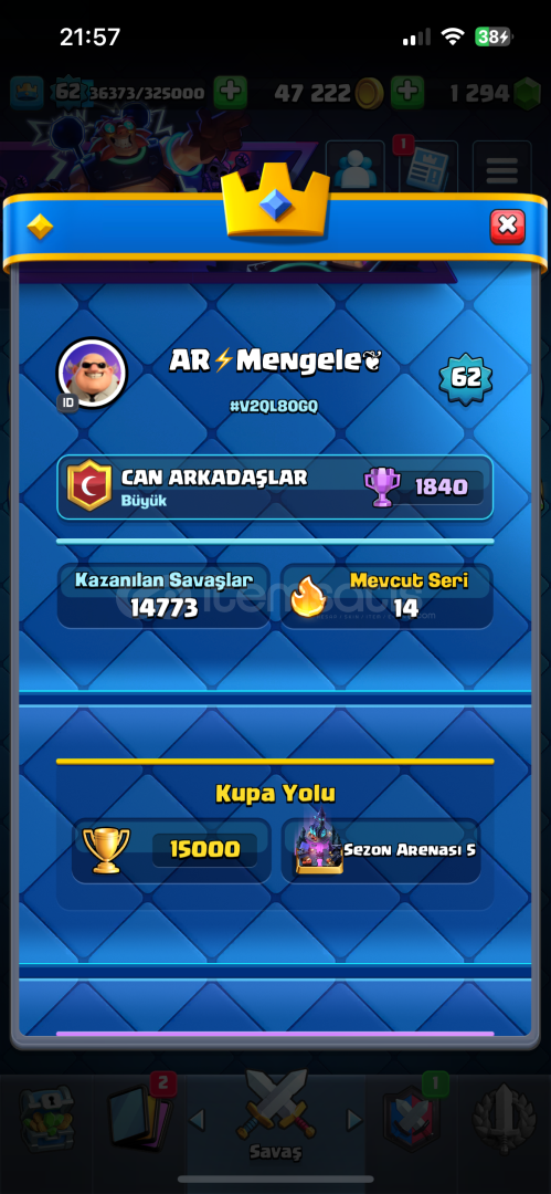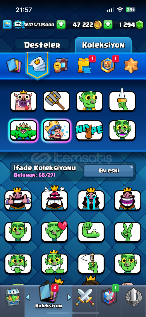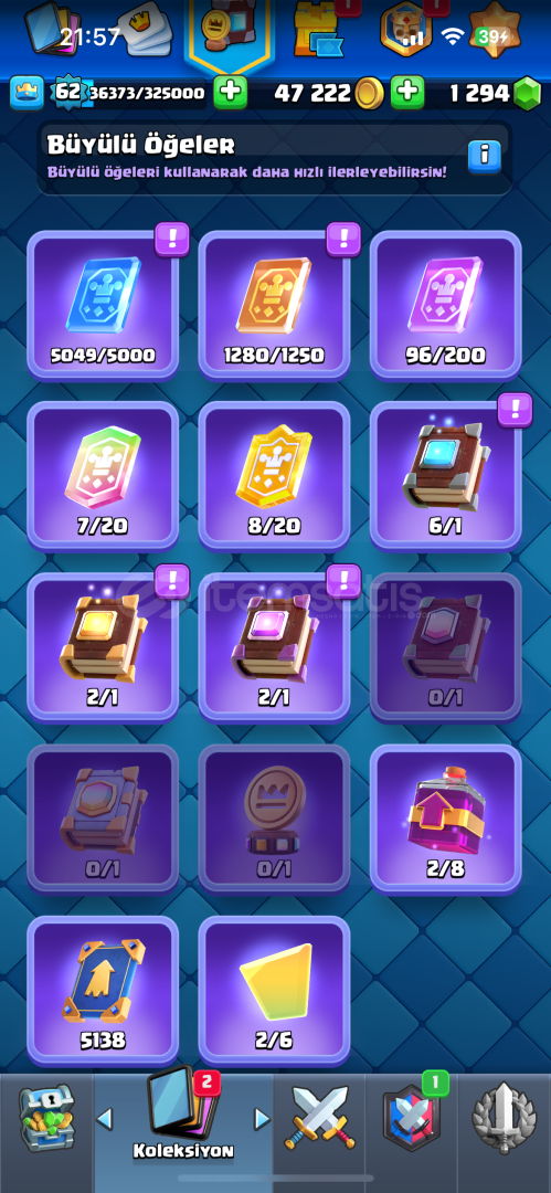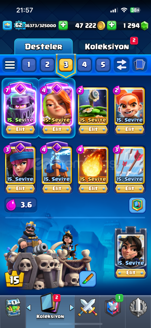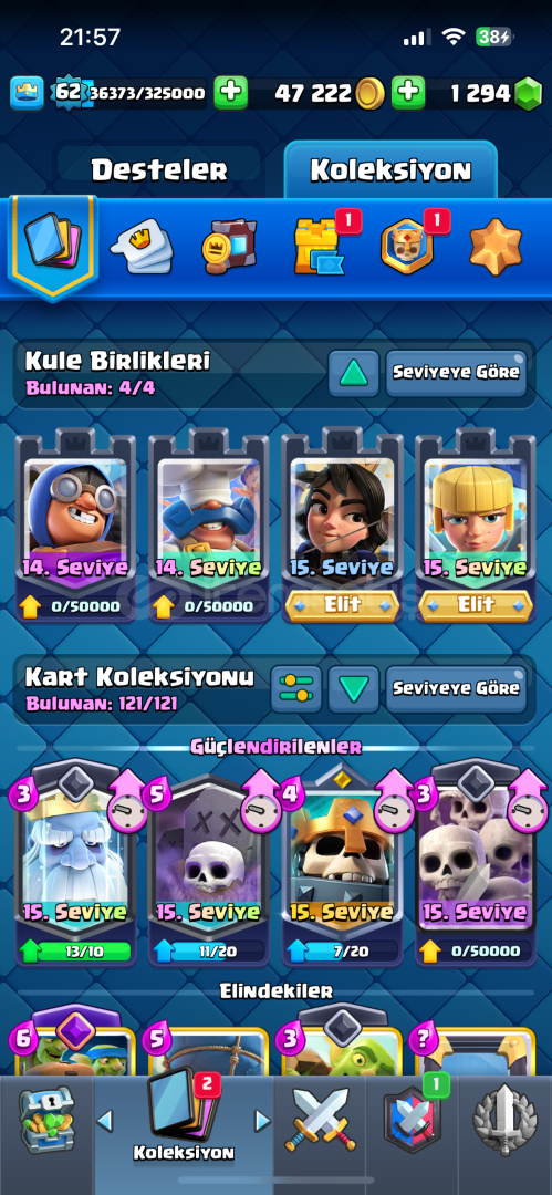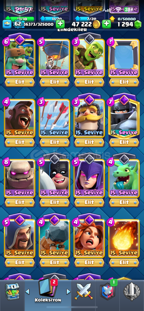 🔹62seviye 📌🔹15000 kupa 🏆🔹16 evrim ⛳🔹68 emoji 🃏🔹Hançer ve prenses kuleleri 15 diğerleri 14 sv.🎖️🔹32 elite kart ✅🔹86 max kart ✅🔹Jokerleri dolu dolu 💎🔹Hesapta nerdeyse tüm kartlar maxlanabilir sadece para eksik🔹Koruma yok mail değişiyor🔹Bilgi ve iletişim için   ☎️ 0536 477 7518