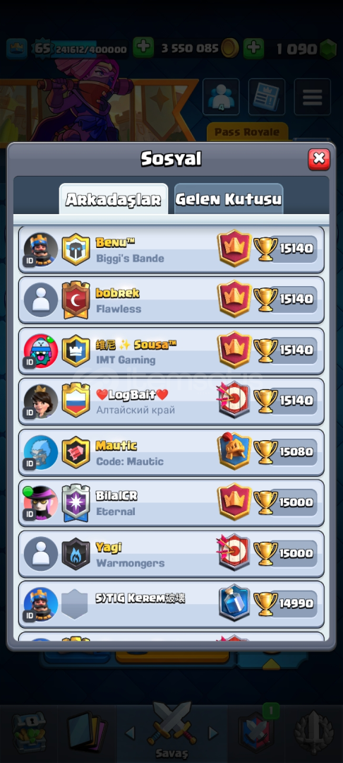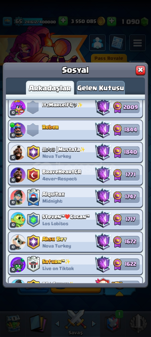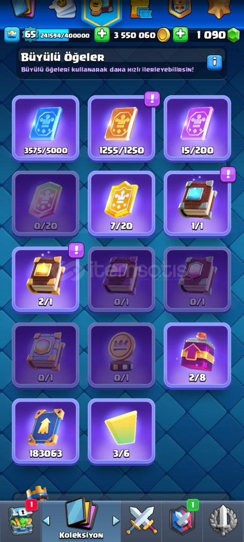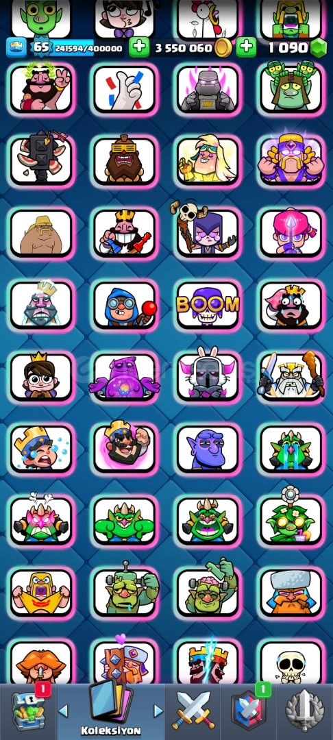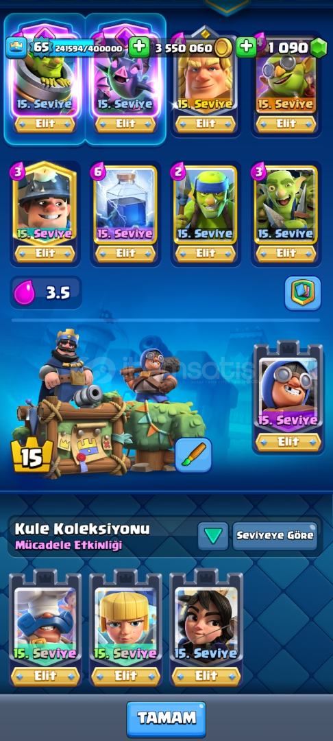 🔥 Hesap Özellikleri:- 👑 Seviye: 65 | XP: 241.594 / 400.000- 💰 Altın: 3.550.060 | 💎 Taş: 1.090- 🃏 53 adet Level 15 (Elit) kart- 🃏 66 adet Level 14 kart- 📊 %97 Level 14 kart tamamlama- ⚡ Evo kart koleksiyonu aktif, kule kartları full- 🎭 Zengin emote koleksiyonu (Kral, Goblin, Büyücü vs.)- 🏰 Nadir kule görünümleri (Şef, Sarışın, Karanlık karakter)-...