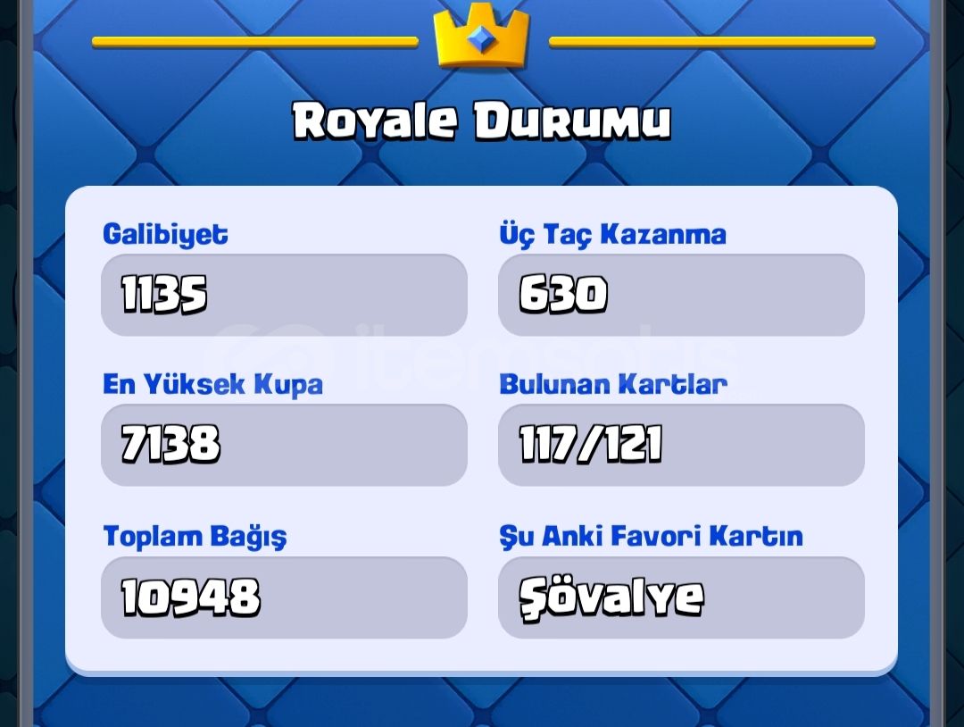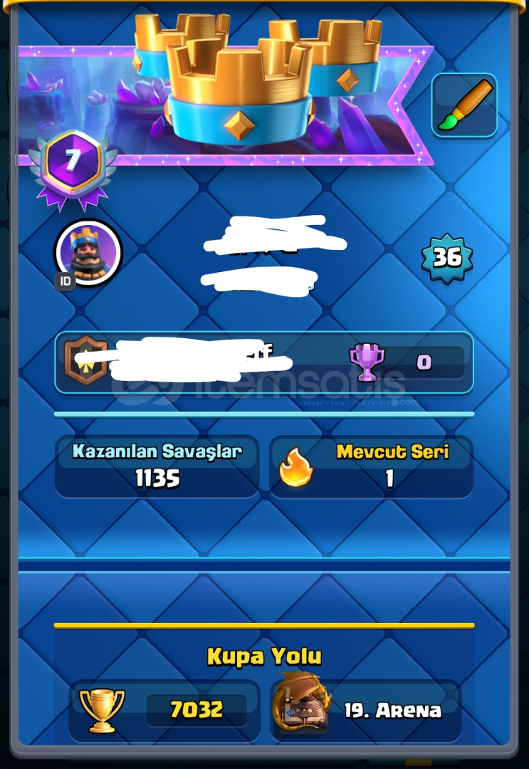 i'ban üstünden 700tlye verilirhesap 7 yıllıktırilk sahibiyimsupercell id eposta ve supercell id isim değişiklik hakkı vardırnerdeyse tüm kartlar açıktırsupercell idye bağlı brawl stars ve clash of clans hesapları da vardırleveli 36dır ana kule 12 lvldir