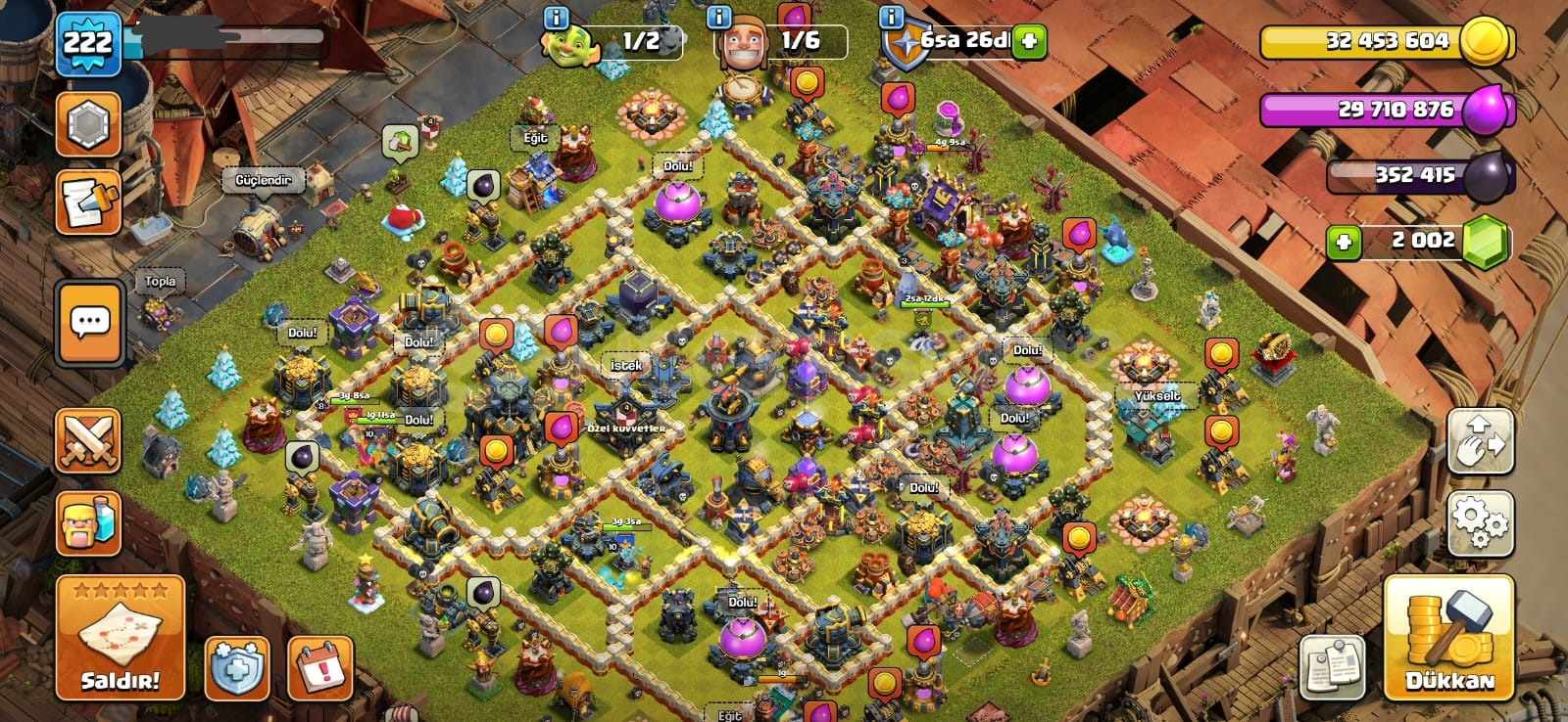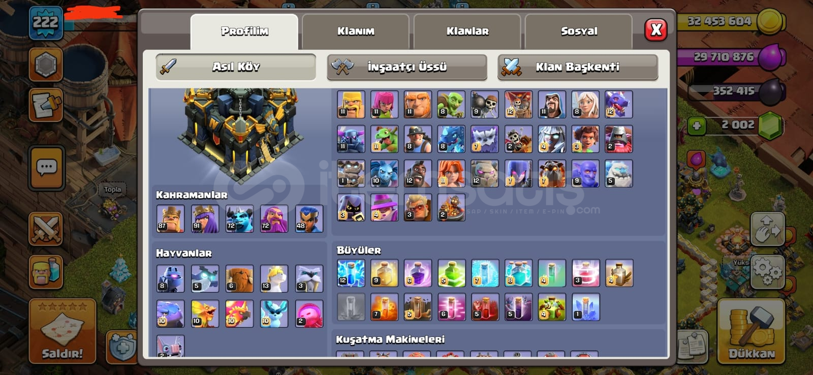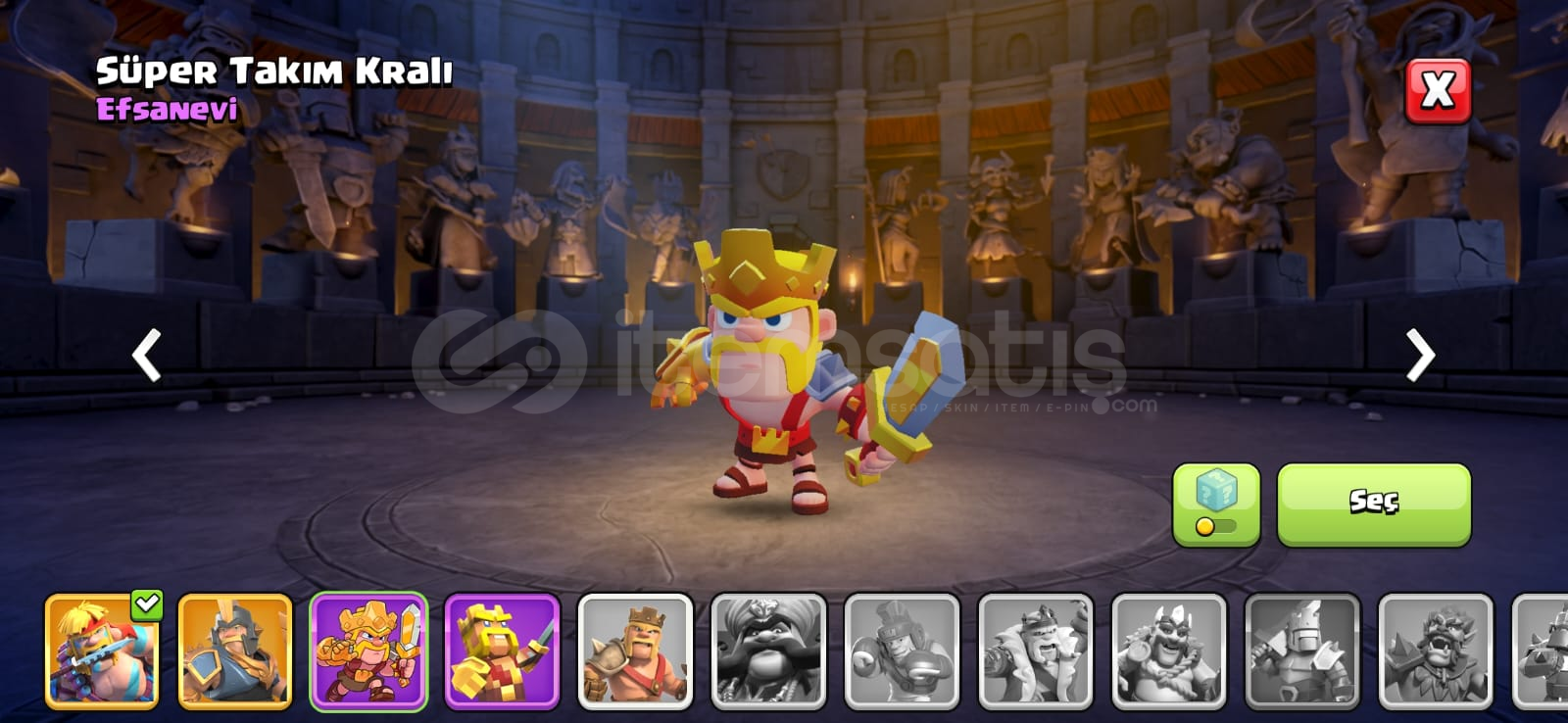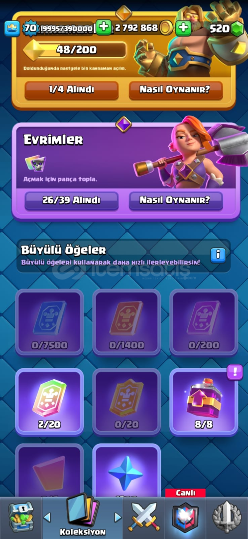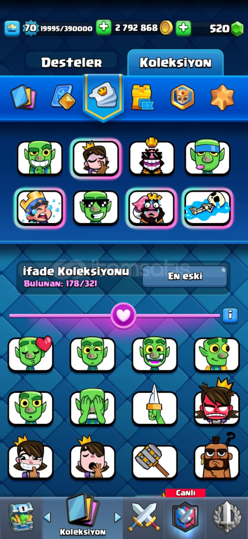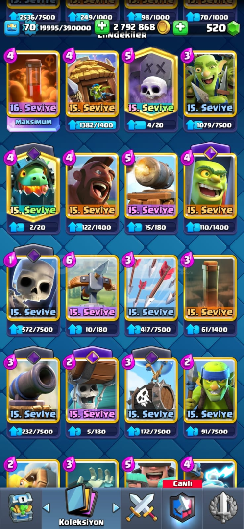Cr de 60 civarı 15 lvl kart var gerisi de 14 seviye,26 evrim ve 178 emoji var. Cocta parayla alınmış xl arka plan ve kostümler var 30 milyonun üzerinde altın ve iksir duruyor çok kısa sürede maxlanacak bir hesap.