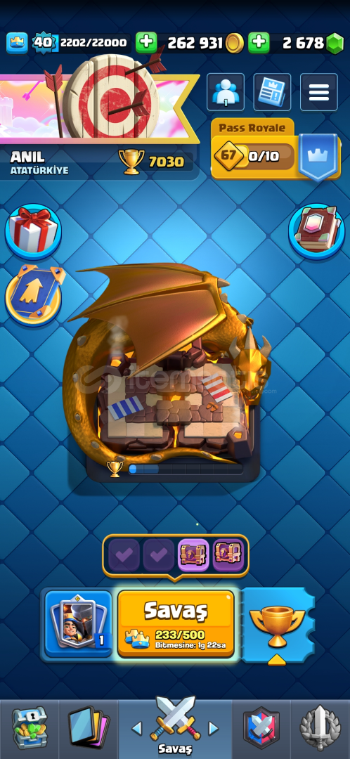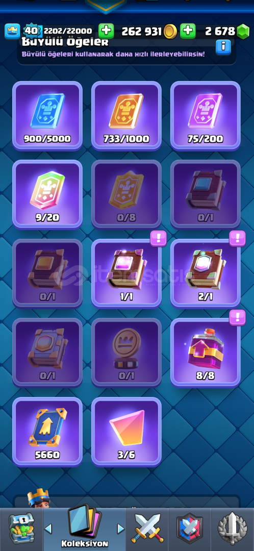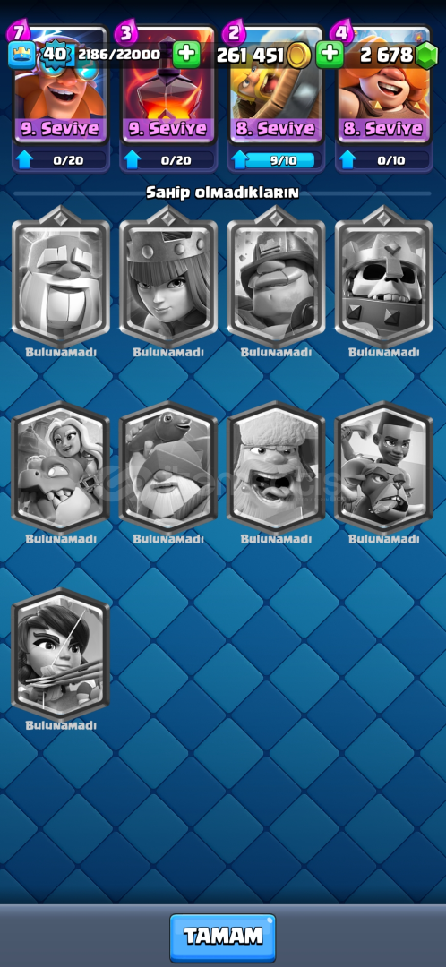Hesapta sadece 9 kart eksik 2700 taş 260k altın seviye atlatmak için istediğiniz kartlar için yeterli kart eklemeleri vardır.Kraliyet Devi Evrimi Açık