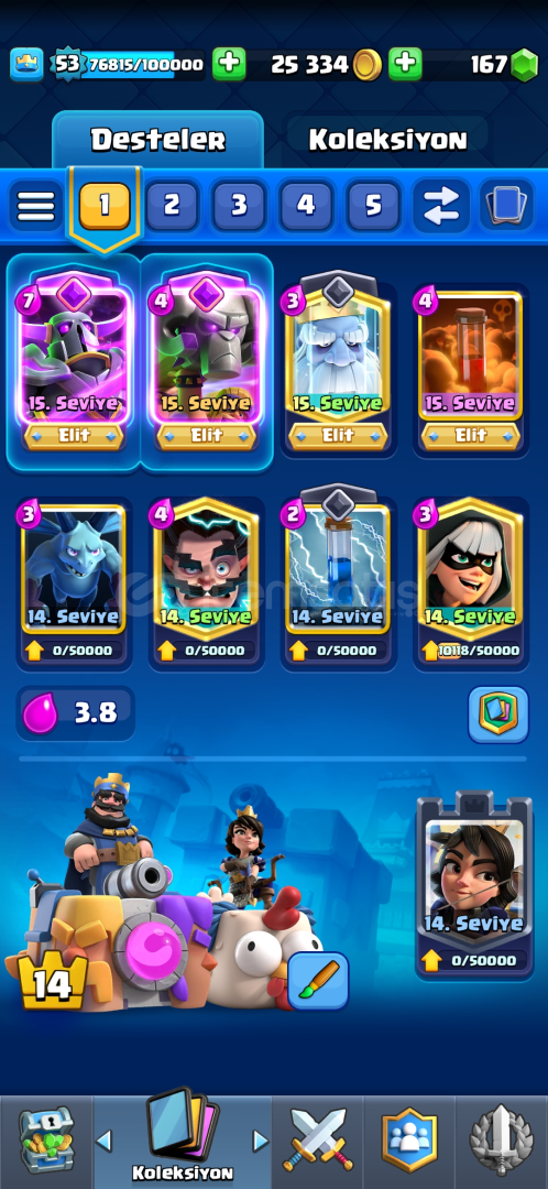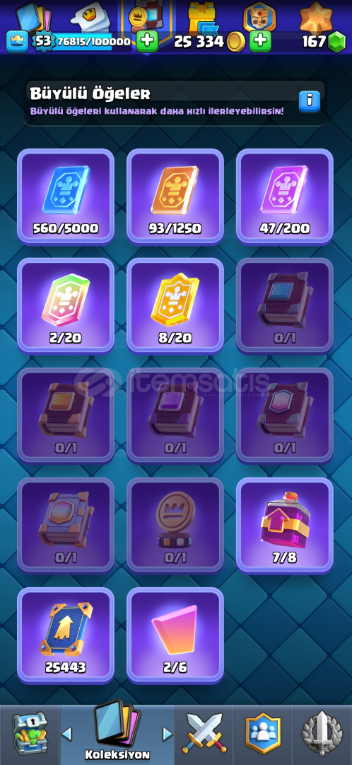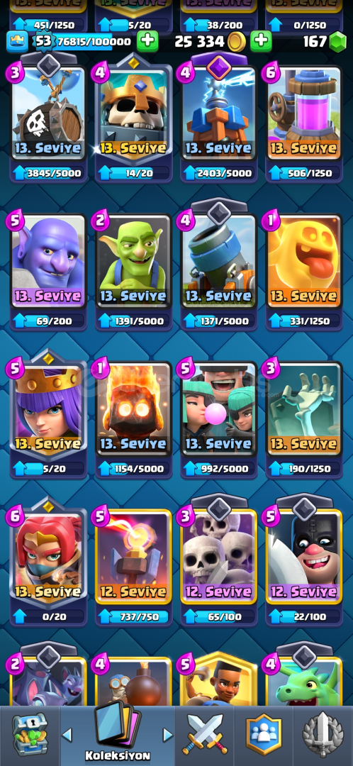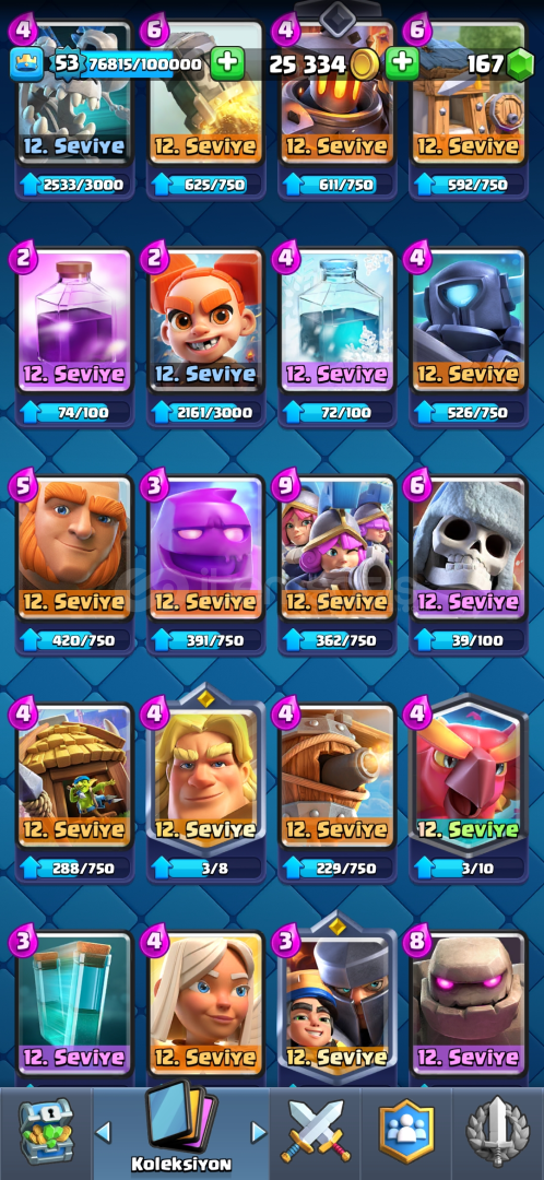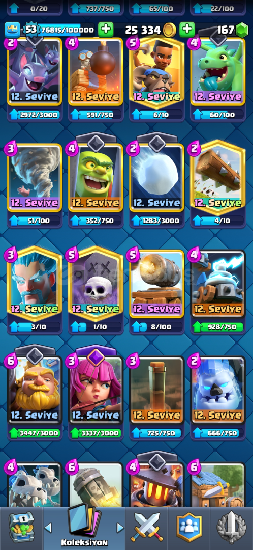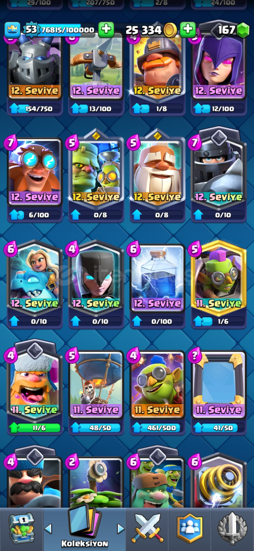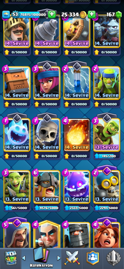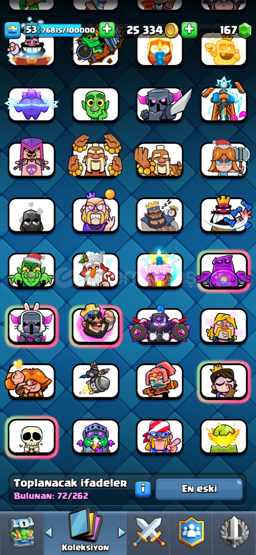 72 EMOJİ, 9 EVRİM4 TANE 15 SV, 30 TANE 14 SV53 SEVİYE 7 KULE SKİNİ9.5k KUPA 170 ELMAS